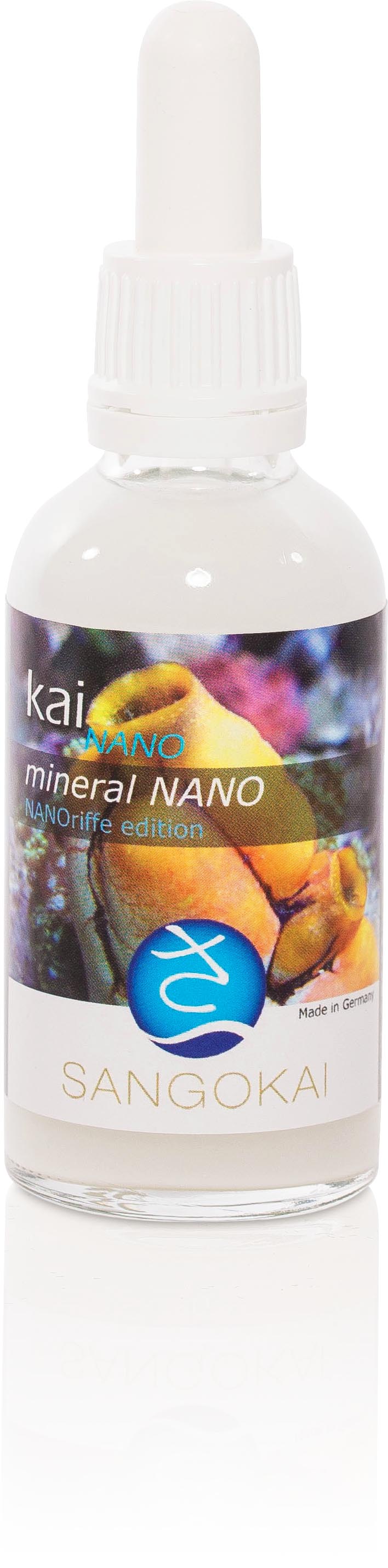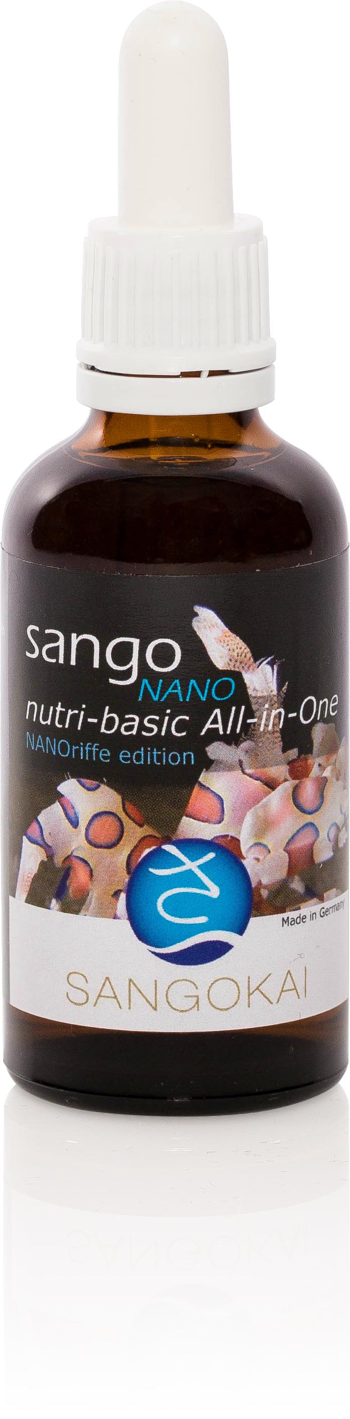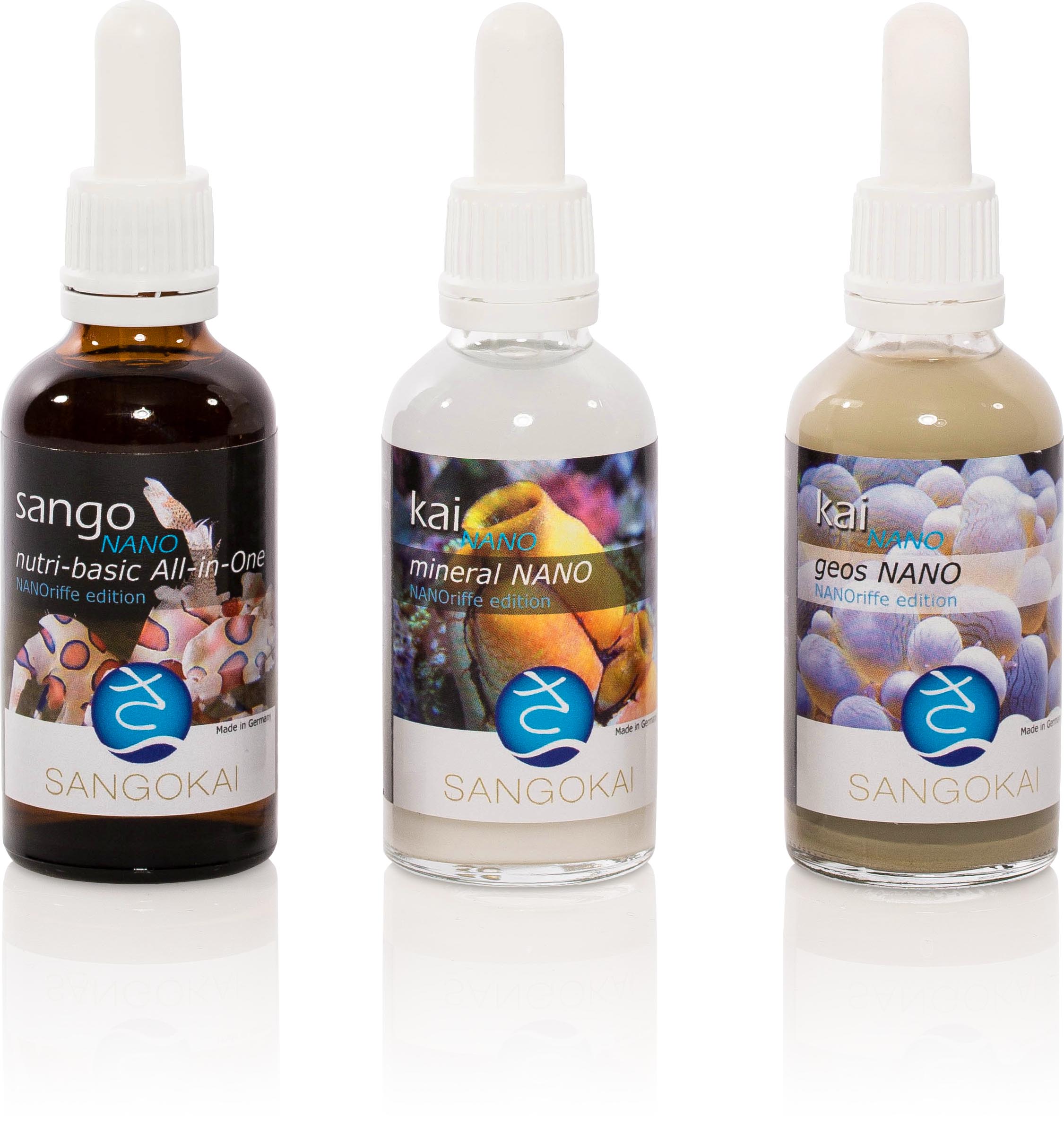 Die drei sango nutri-basic Produkte werden hier in einer modifizierten All-in-One Lösung bereitgestellt. kai mineral NANO und kai geos NANO sind in ihrer Wirkstoffzusammensetzung auf die Nano-Dosierungen angepasst. Daraus ergibt sich das 1+2 NANOriffe edition System.