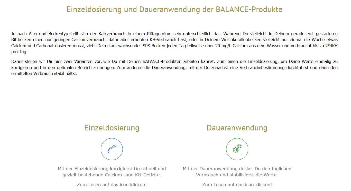 Es gibt hier 3 Produkte. Für Ca das chem-balance CA1 und das chem-balance CA2, dieses wird immer zu gleichen Teilen dosiert. Für KH gibt es das chem-balance KH.