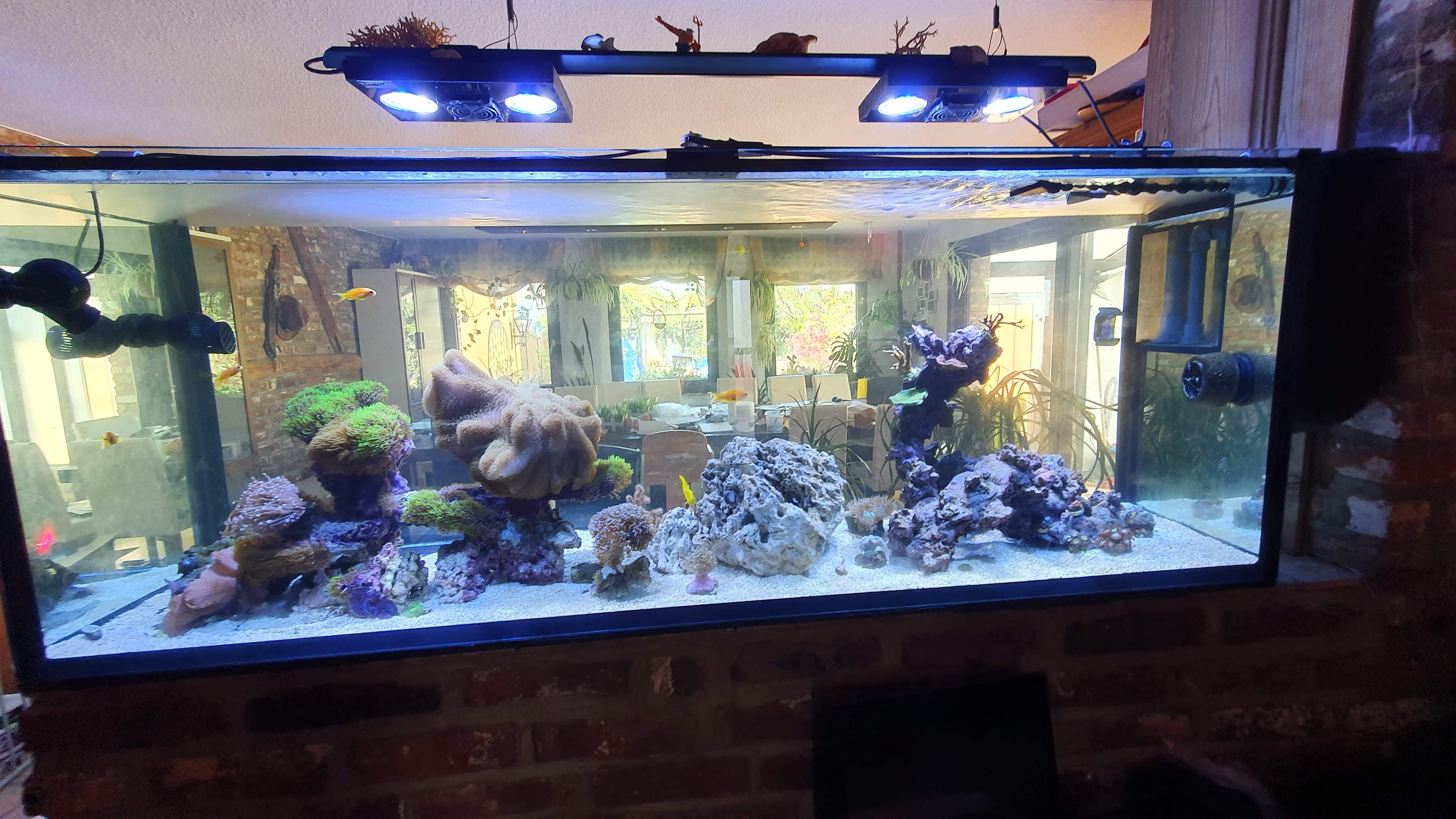 Habe Teile aus CaribSea Life Rock gebaut (rechter Teil), ATI Fiji White Sand im Einsatz, ein Lochgestein (mitte) und den Rest aus meinem alten Riff (war ein Teilriffumzug, linker Teil im AQ)