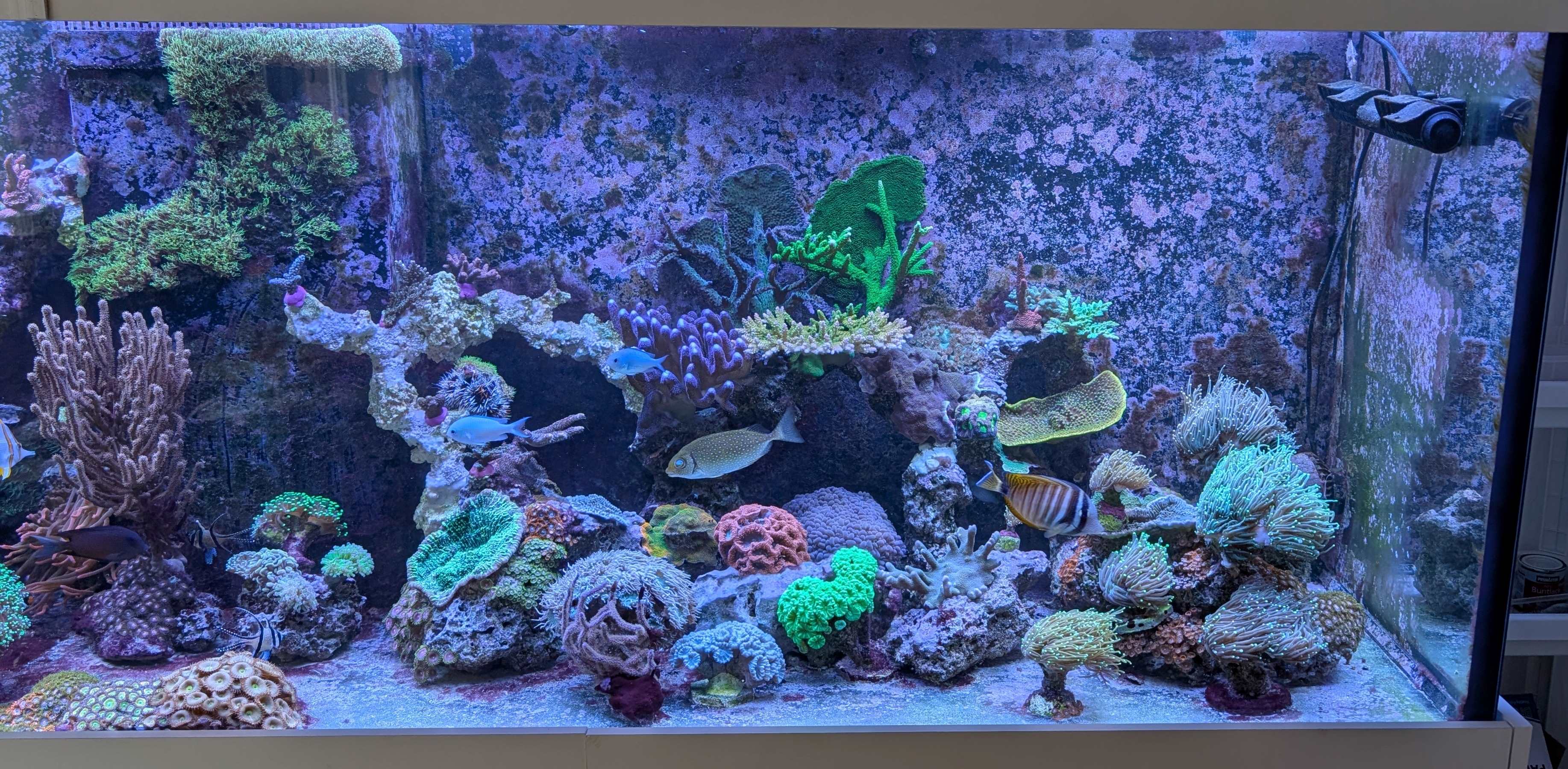 Aktuell 2 Gratillas, so 20 Einsiedler, hab nochmal gezählt, 2 Nardoa Sterne, 5 Tectus Schnecken und weit über 100 Turbo setosus. Nächste Woche kommen noch 10 Turbo Fluctuosus dazu. Fraßdruck wäre vorhanden. Die gehen alle an grünes, aber nicht an diese rötliche Pest.