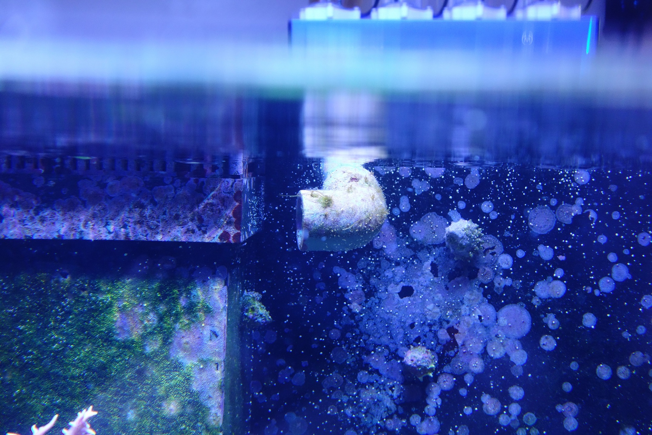 Sieht nach einem normalen Biofilm aus ehrlich gesagt. Lange "Haare" kann aber auch eine Goldalge sein, das müsste man unter dem Mikroskop schauen. Goldalgen sind oft auch etwas "schwammig" oder sehen aus wie eine Nudel mit einer apikalen Gasblase, was zu dem englischen Namen "golden noodle" geführt hat. Sowas regelt sich, warte mal ab und ehrlich gesagt gehört das auch dazu, das Riff ist auch nicht 100% clean...
