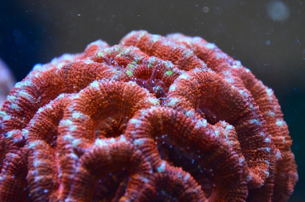Ich bin mit mit den Farben meiner Acans nicht wirklich happy. Insbesondere eine meiner Acans sollte eigentlich grundsätzlich rot mit hellgrünen Flecken an den Polypen sein. 2 Polypen zeigen das auch, bei den anderen sind die "Flecken" weiß / hellgrau. Die Grundfarbe ist allerdings auch eher dreckig orange...