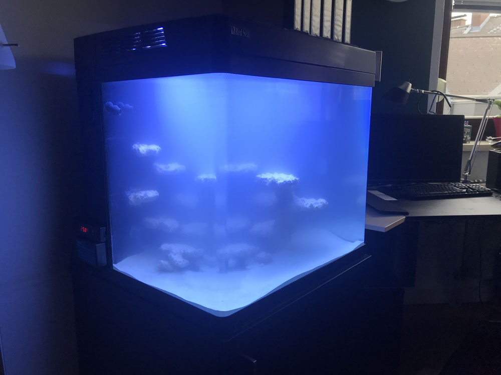So nun wie gesagt habe ich vor 14 Tagen gestartet. Zuvor noch mit Fauna Marin Pro Salz aufgesalzenenes Osmosewasser gefüllt, Riffkeramik rein, und Red Sea Life Sand rein.