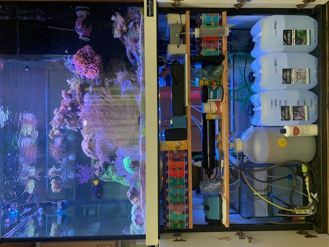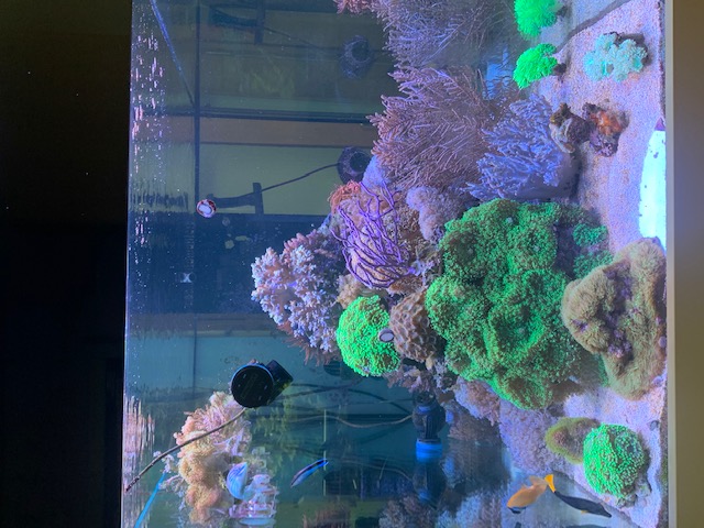 Vor gut einem Jahr habe ich im Zuge eines Umzugs einer Arbeitskollegin Ihr 640l Meerwasserbecken übernommen und komplett neu aufgesetzt. Dabei verwende ich als Salz: Red Sea SALT Pro und das ATI Essentials System (KH, CA, MG). Das Becken hat einen Ozongenerator, der über eine PH-Elektrode überwacht wird, sowie eine UV-Anlage. Beleuchtet wird über 2 programmierbare ATI Sirius X4. Die Beleuchtungszeit habe ich nun auf 10 Stunden reduziert. Diese war wohl bisher mit 12 Std. zu lange.