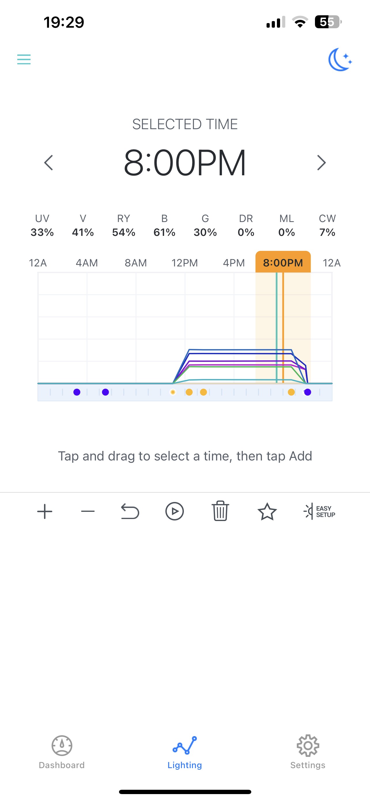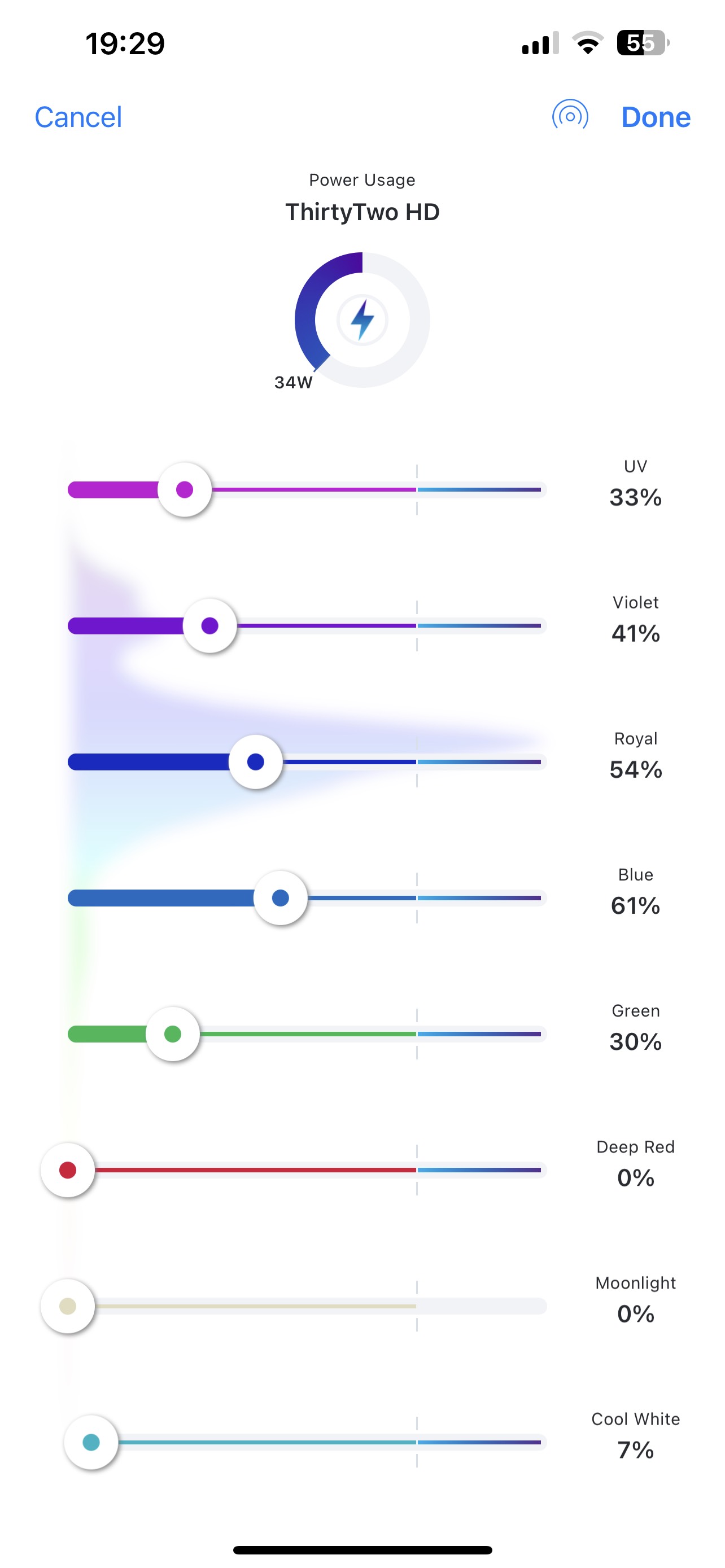 Wie lange beleuchtest Du genau, das kann man auf dem Profil immer nicht so gut sehen. Ich würde nicht so blaulastig fahren, Royalblau und blau kannst Du so lassen, violett auf 35, UV auf 25, grün auf 15 und cool white geh bitte hoch auf 45 oder 50. Dann wäre es aber auch gut, wenn Du z.B. mit der Photone App (Infos dazu in unserem Video auf dem SANGOKAI YT Kanal) mal die Intensität unter Wasser nachmisst, damit man die Lampe in der Intensität exakter einstellen kann. Aber bitte nochmal eine kurze Info, von wann bis wann Du wirklich beleuchtest.