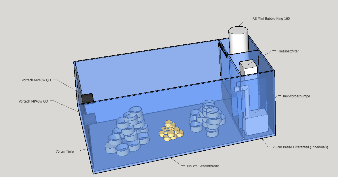 Bezüglich der Strömung ist mir wichtig, dass die Pumpen möglichst leise arbeiten und steuerbar sind. Die MP40w QD haben mir auch gut gefallen, da diese den Außenmotor haben, der die Wärme außerhalb des Aquariums abgibt. Zudem ist der Teil der Pumpe im Aquarium relativ kompakt. Ich könnte im Filterabteil eine Trockenkammer für den Außenmotor der MP40w QD bauen, da bin ich dann aber unflexibel, was eine spätere Umplatzierung angeht. Ich bin aber nicht auf die MP40 festgelegt, es könnte auch eine andere Strömungspumpe werden.