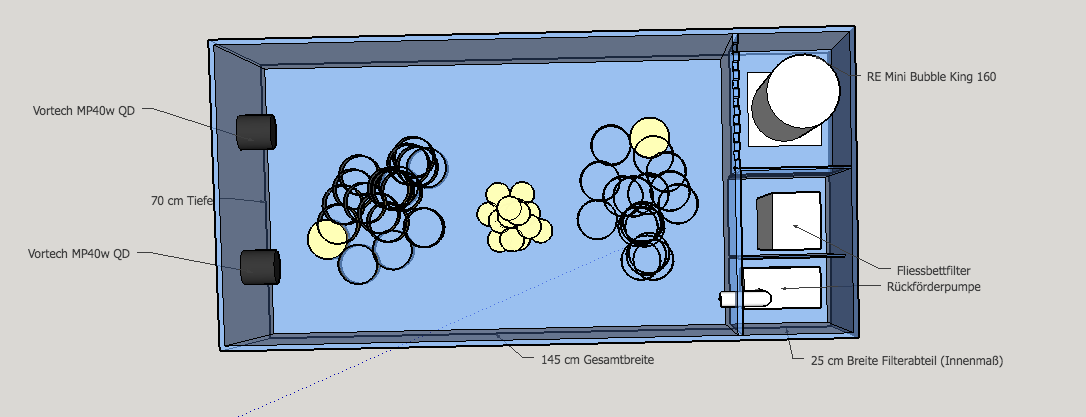 Wenn ich auf die MP40w QD setzen würde, wie in der Zeichnung eingeplant, dann käme vermutlich nur die eingezeichnete Platzierung in Frage. Denn sonst müsste ich auf der Filterabteilseite zwei Trockenkammern einrichten, was mit dem recht lange Überlaufkamm vermutlich eher schwierig wird.
