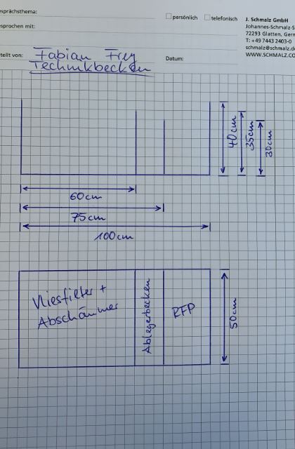 Anbei mal eine Zeichnung meines Technikbeckens. Der Abschäumer steht (erhöht auf Lichtrasterplatten - wegen dem max. Wasserstand für den Deltec) in der großen Kammer. In dieser ist auch noch Platz für einen Vliesfilter bzw. Rollermat den ich auch schon zuhause habe. Würde aber gerne mal ohne starten.