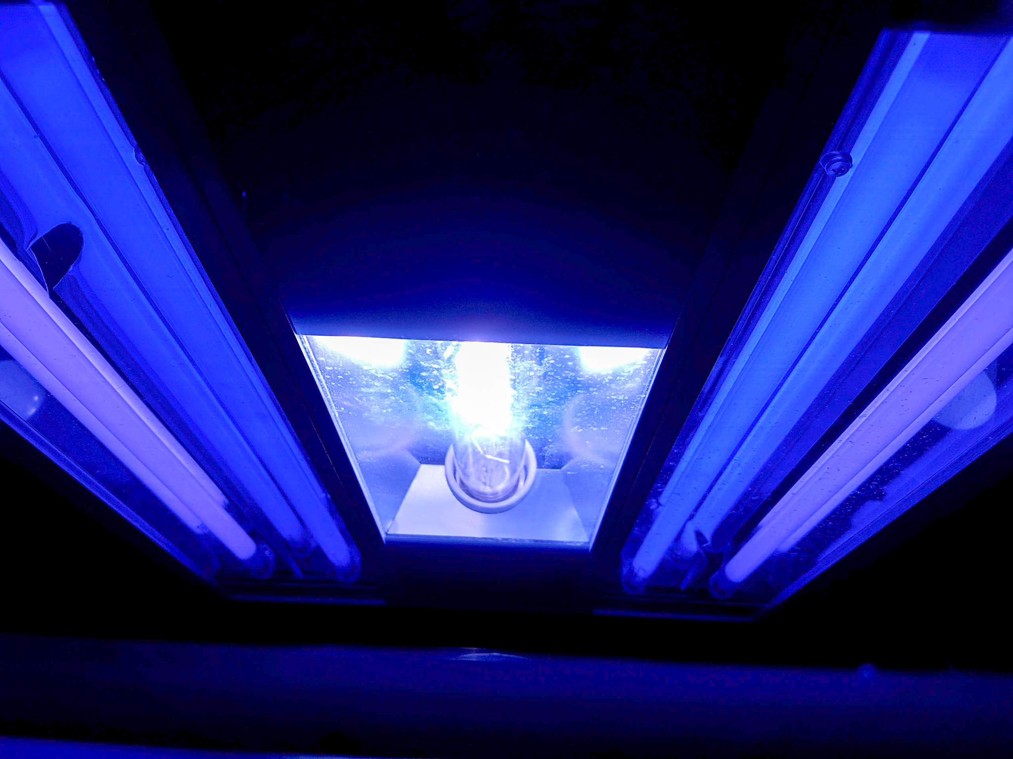 Als Beleuchtung hab ich jetzt eine Aqua Photon 400W Hqi +4x24 Watt T5.