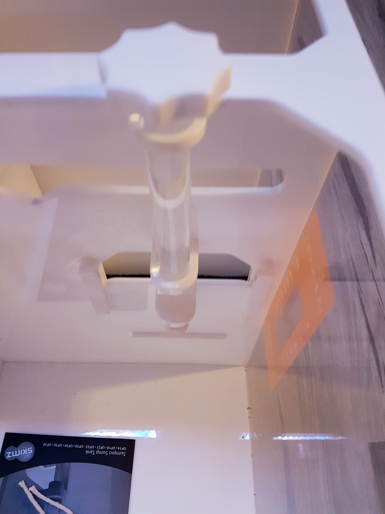 Es hat Halterungen für Elektroden und Dosierpumpenschläuche sowie einen justierbaren Wasserstand in der Abschäumerkammer.