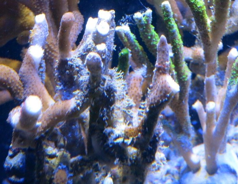 Einige Stellen waren durch Lichtabschattung und Strömungsmangel schon weiß, unten werden sie teilweise schon abgestorben sein.