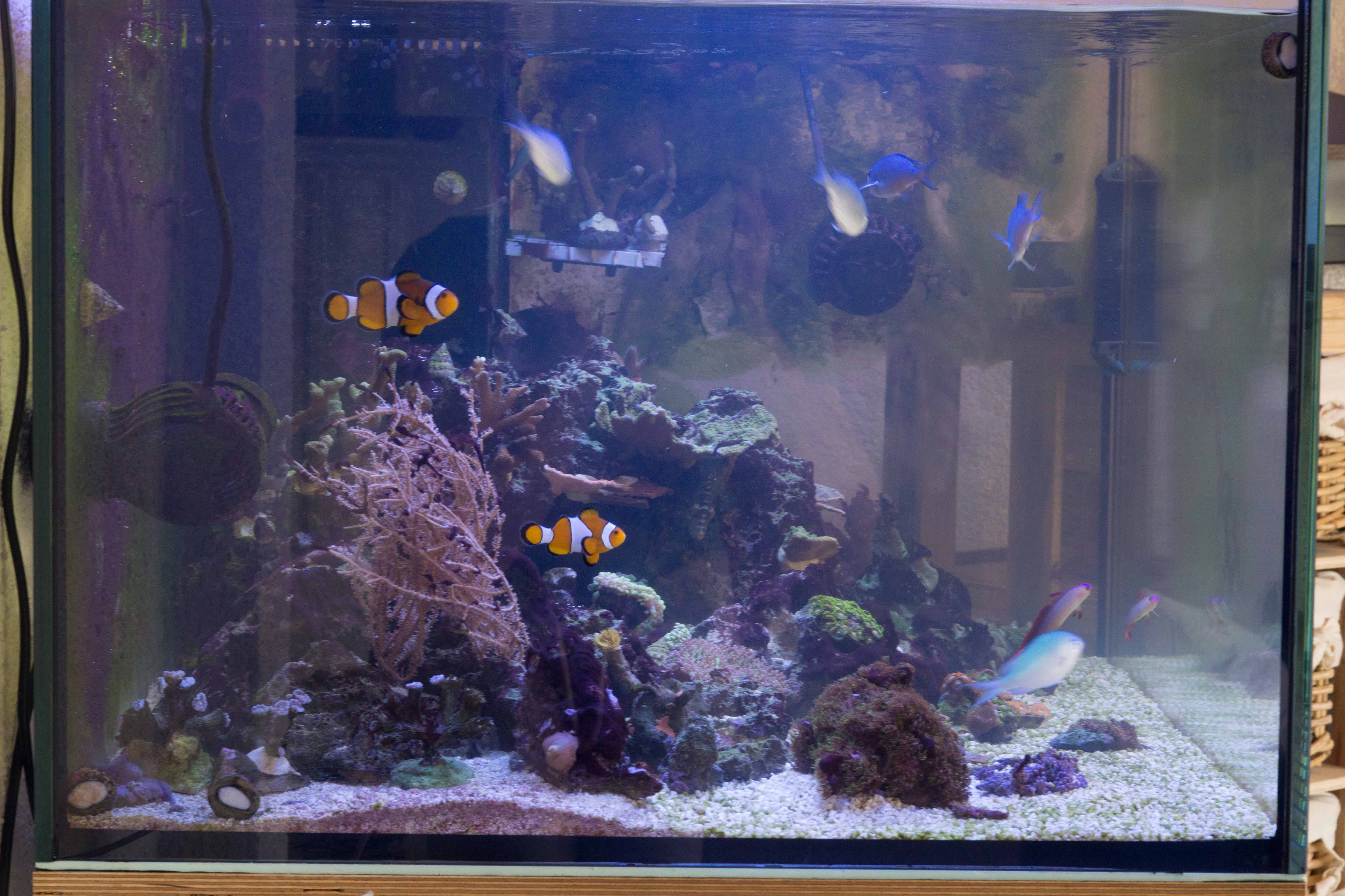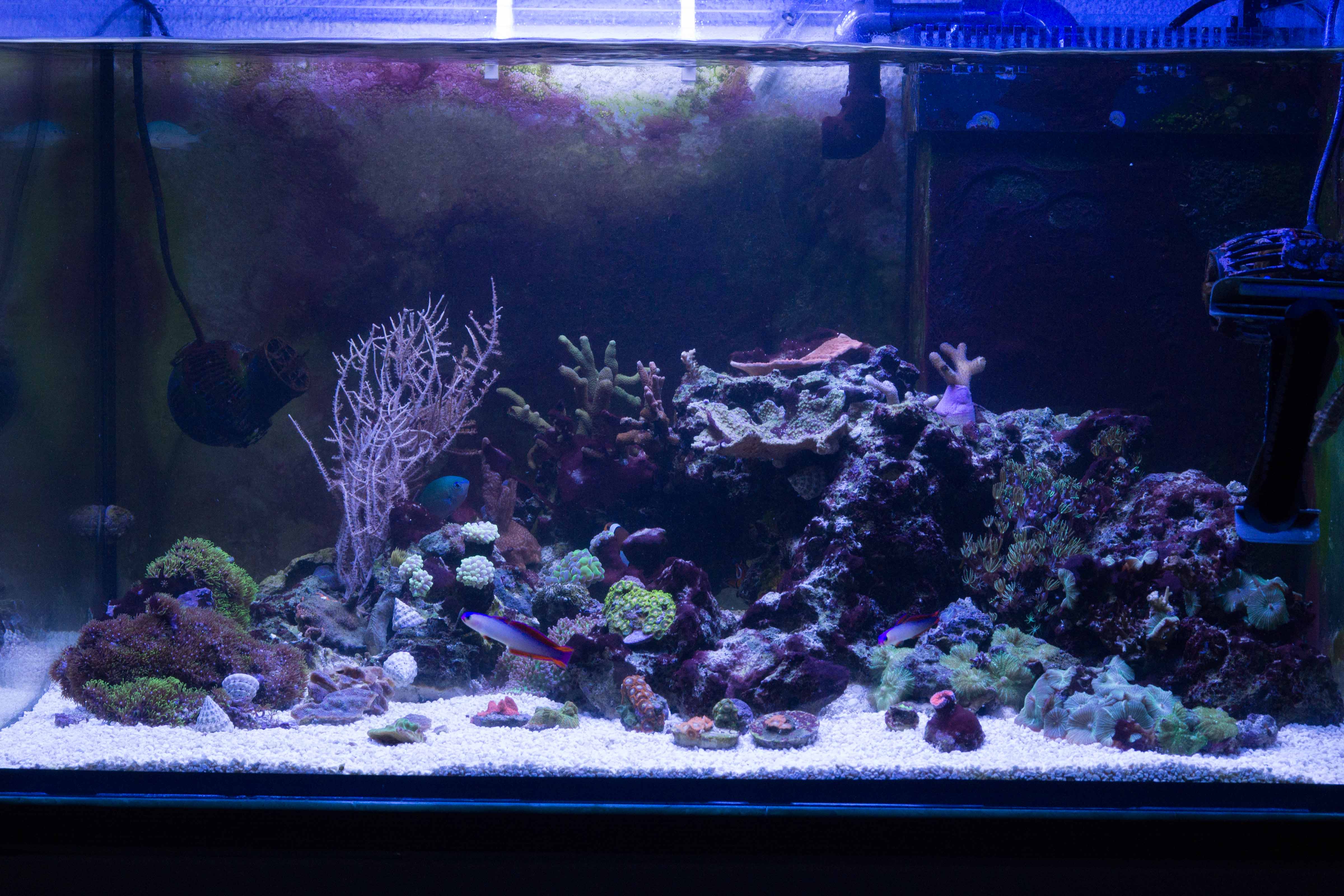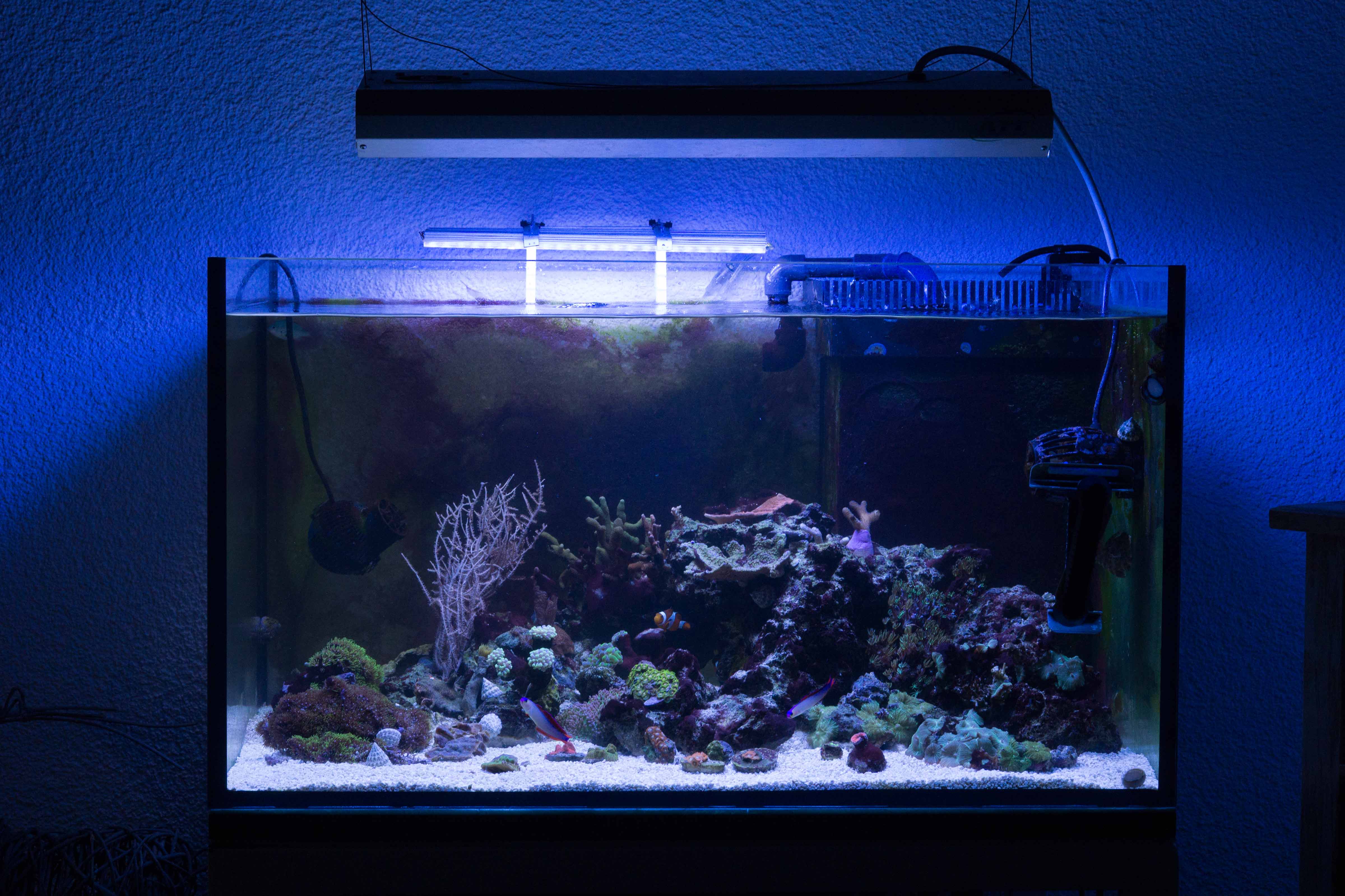 Im Moment siehts soweit ganz gut aus. Nur die Anemone zickt rum und an den Scheiben die ich nicht sauber mache wächst wieder etwas grünes was aus sieht wie Cyanos.