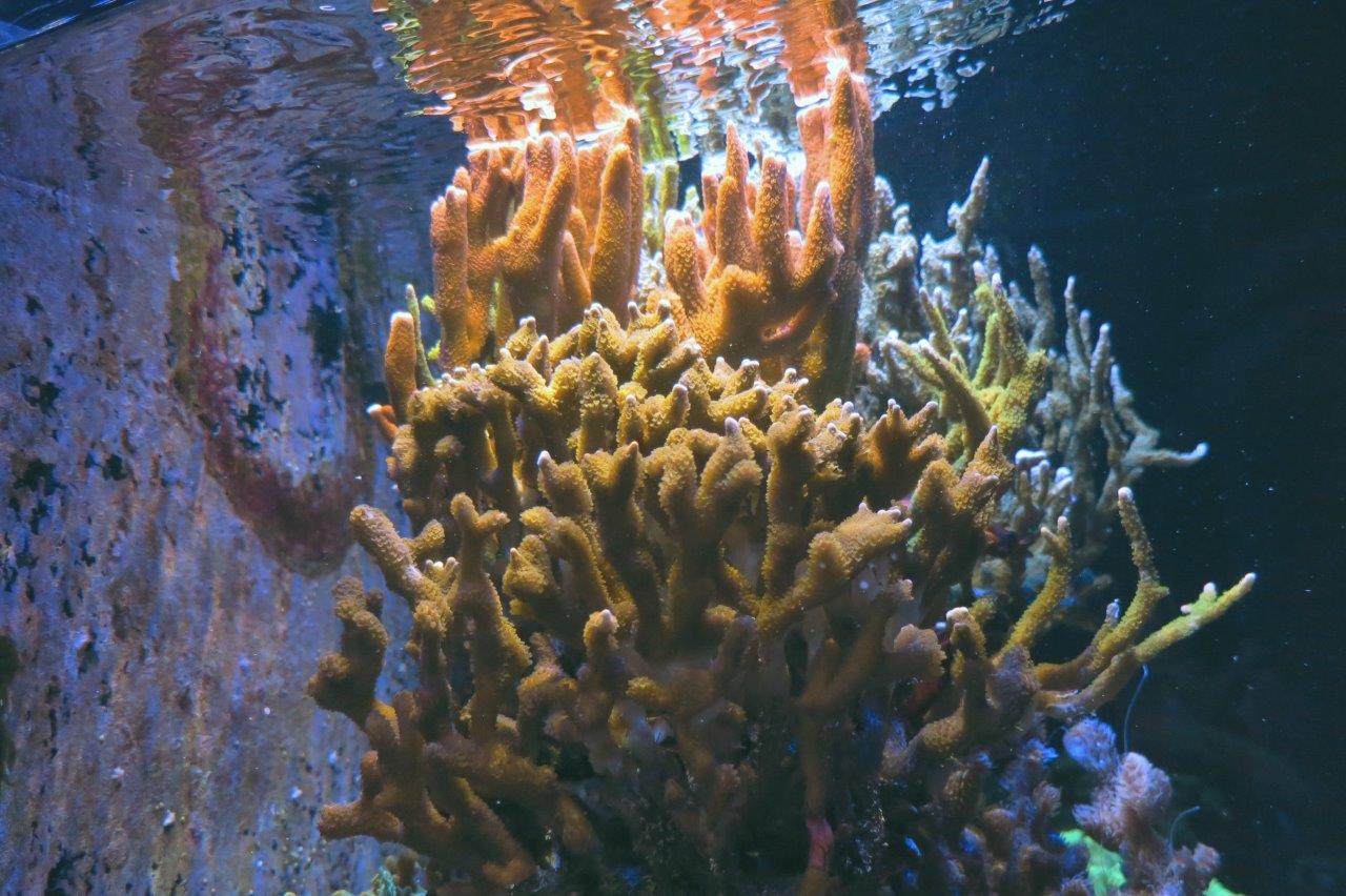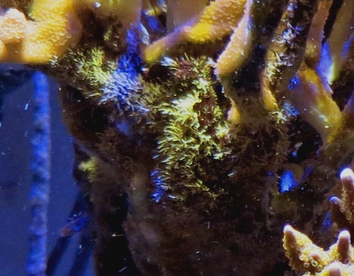 Am liebsten würde ich dies mit allen Korallen auf dem Riffdach machen, beispielsweise die rote Koralle stirbt auch von unten ab und wird mit Algen (?) bewachsen. Dies ist jedoch viel schwieriger. Sie sitzen viel fester auf dem Riff, da habe ich Angst, dass mir alles zusammenbricht. :o