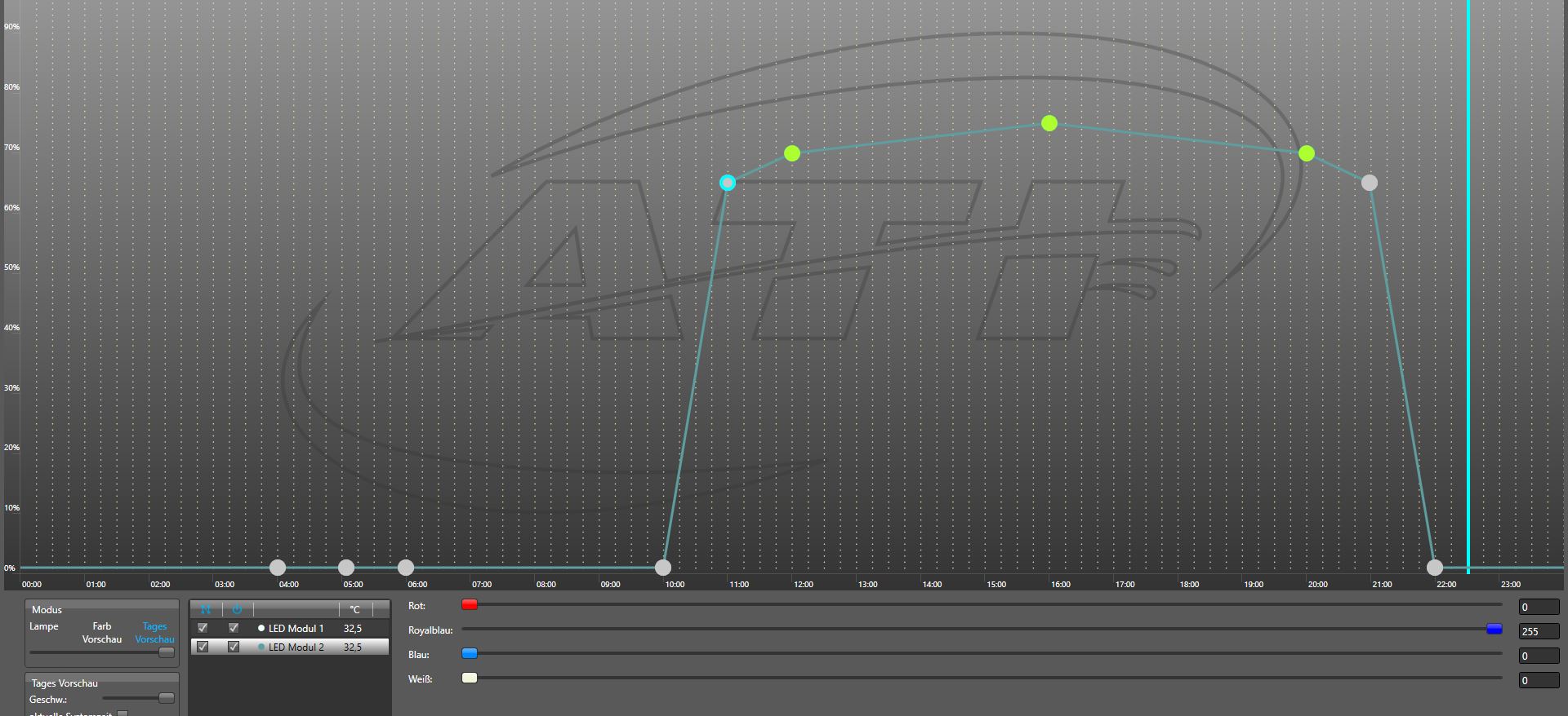 ATI Royalblau 180,Weiß und Blau 255,Rot 0-20 / auf und abdimmen 30min / am Abend mit Blauphase