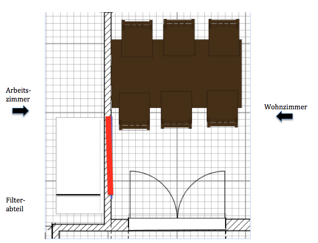 anbei eine Zeichnung von der Aufstellung. Auf der linken Seite ist das Arbeitszimmer, rechts hinter der Wand das Wohnzimmer. In dem Bereich der rot markiert ist, soll die Wand einen Durchbruch ca. in Aquariengröße bekommen. Somit sieht man vom Wohnzimmer die komplette, breite Seite des Aquariums, das Filterabteil jedoch nicht. Im Arbeitszimmer sieht man dann natürlich zwei Seiten des Beckens, wobei ich auch die "freie" linke Seitenscheibe mit schwarzer Folie versehen werde. Das Filterabteil wird aber auch mit "Schwarzglas" versehen werden, so dass man nicht hineinblicken kann. Somit kann man vom Arbeitszimmer sowie Wohnzimmer nur über die breite Seite in das Aquarium schauen.