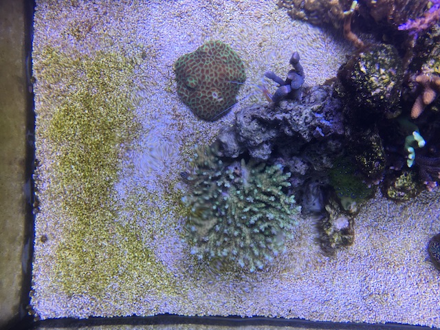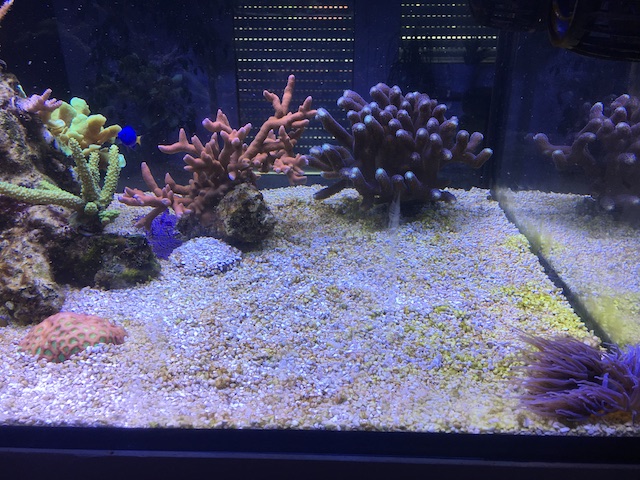 2 Wochen später wuchsen auf dem Bodengrund und auch Steinen (nur auf der Riffkeramik) sehr schnell verschiedene Beläge (Algen und/oder Bakterien). Auch war der grobe Sand schon sehr dreckig und verbacken. Ergo…ein neuer Bodengrund musste her.