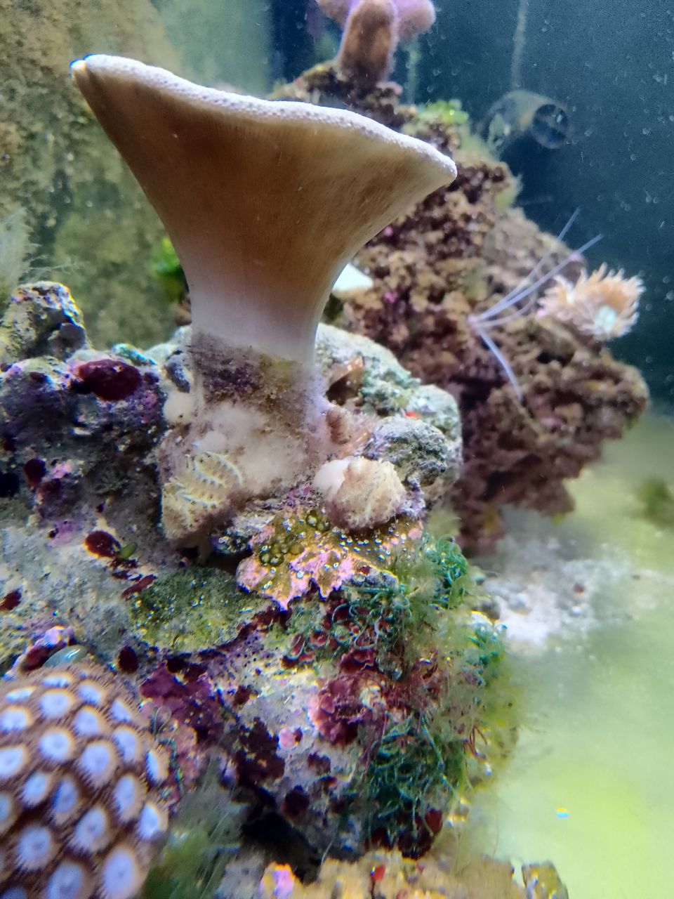 Die Korallen wachsen, nicht so extrem schnell wie es in anderen Becken möglich ist aber Sie wachsen. Auch hat sich ein sehr kleiner KH Verbrauch eingestellt. Minimal aber da, mühsam ernährt sich halt das Eichhörnchen. Kleinstschnecken die ich nie eingesetzt habe vermehren sich. Eine Art Gehäuse-Schnecke, 2 Stück, die aussehen als hätte eine graue Nacktschnecke einen Fingernägel auf den Rücken geschnallt leben auch im Becken. Die fressen auch sehr gut die Algen und sind Tag sowie Nachtaktiv, dabei sogar Recht flink.