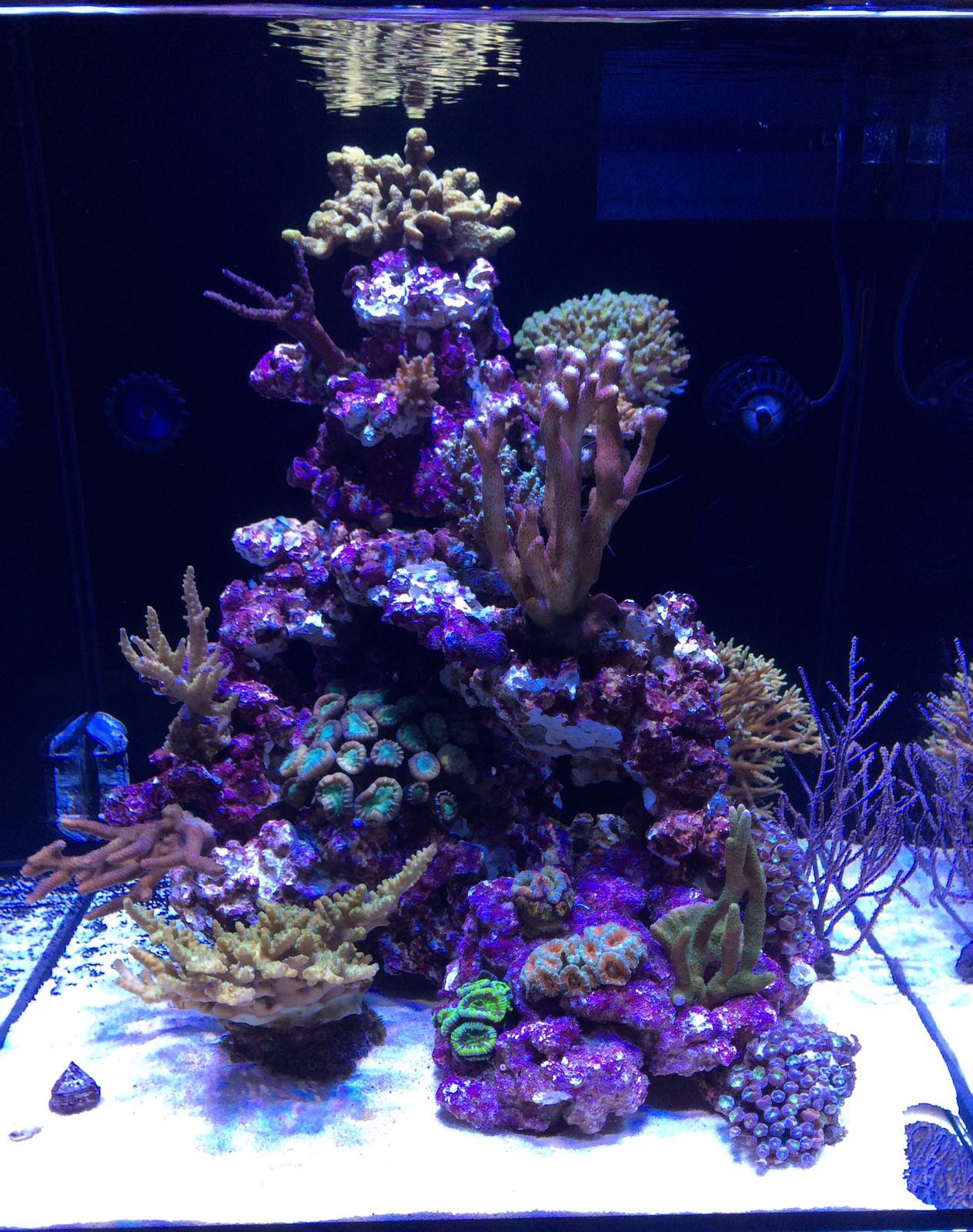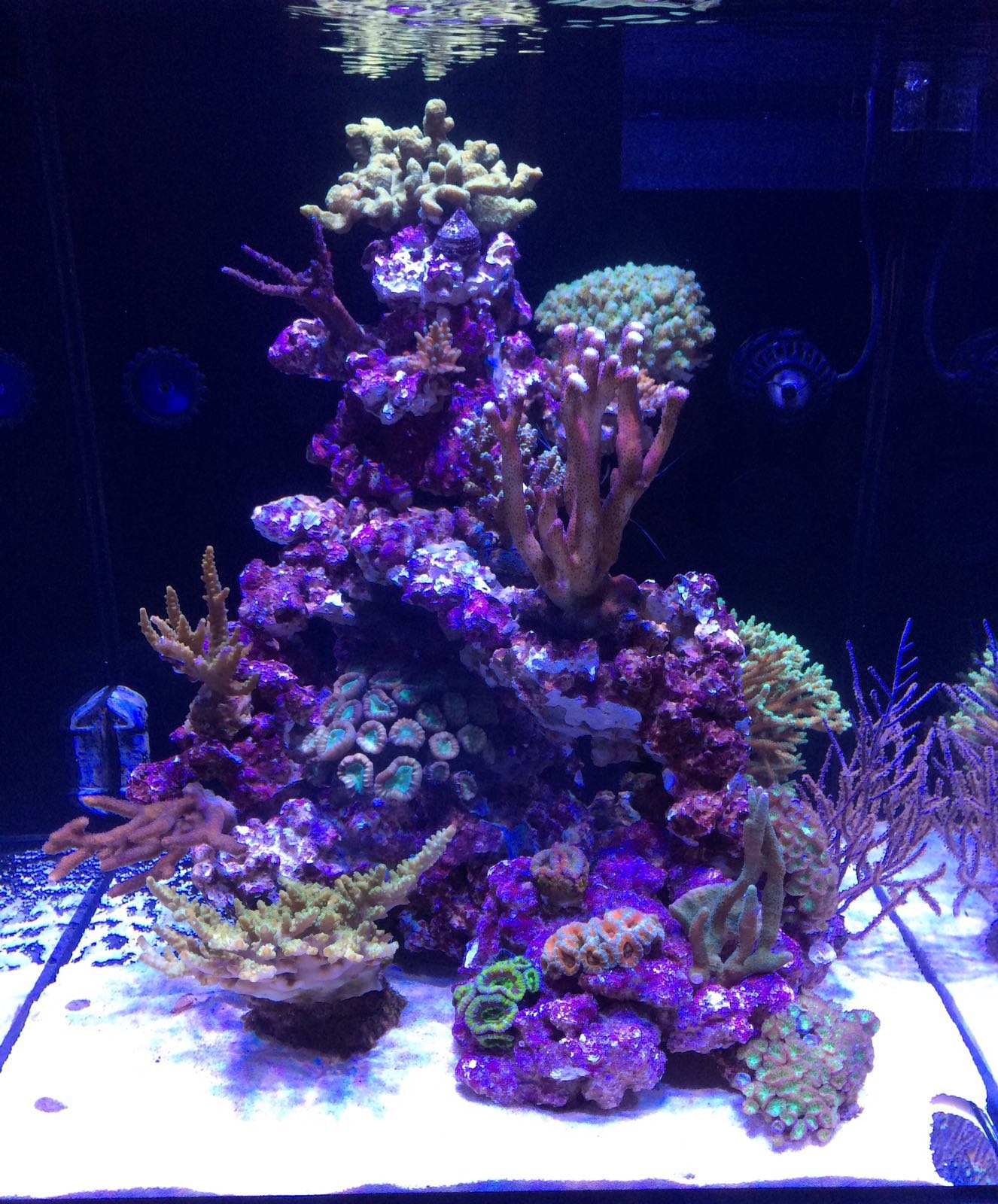 Hier mal das erste Bild vom Becken, die Korallen habe ich noch nicht geklebt da es noch nicht der entgültige Platz ist. So z.B. kommt die Stylophora noch nach vorne rechts unten, die gelbe Acropora am Boden noch aufs Riff usw. Ich möchte damit aber erst noch abwarten wie sich das Becken jetzt entwickelt, und dann erst die Korallen kleben, wenn der nächste Schwung an SPS einzieht. In der zwischenzeit Hände raus aus dem Becken :)