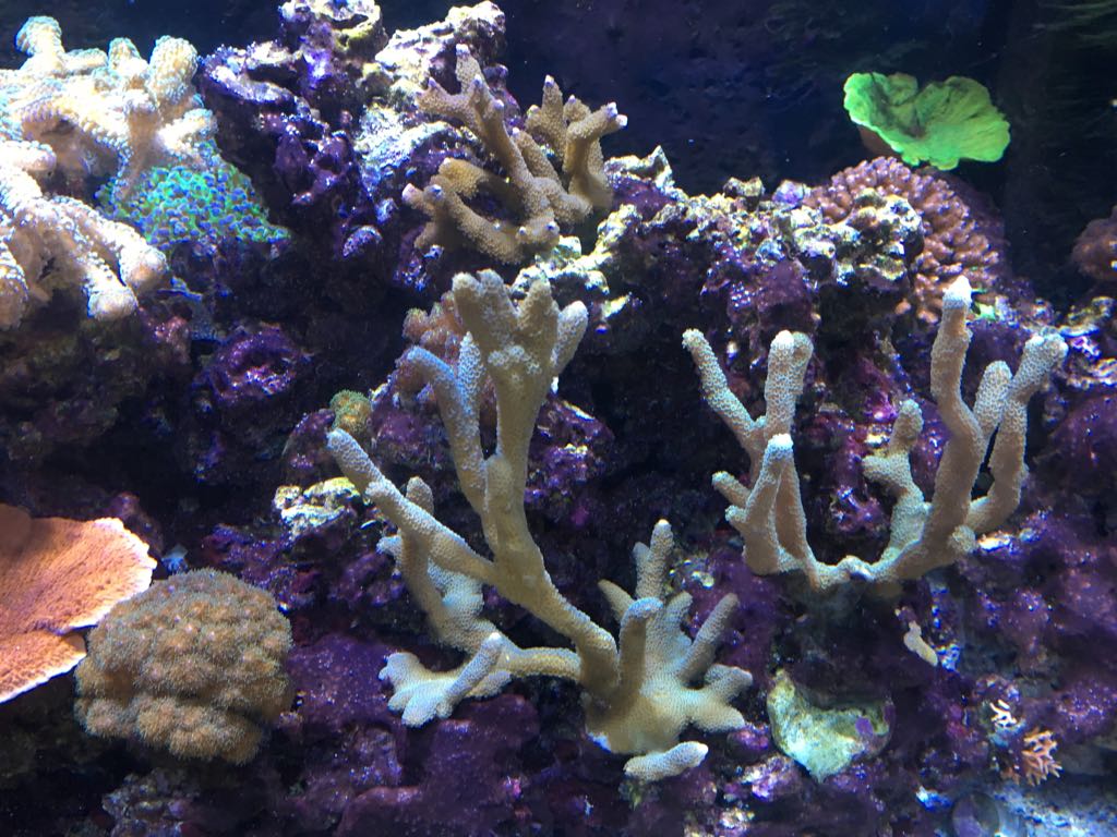Korallen stehen soweit ganz gut, naja die Farben sind nicht so doll, aber die Polypen sind gut da.