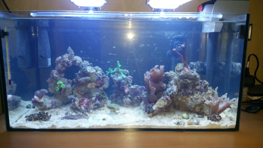 P.s. Ich weiß im Sand sind einige schmuddelecken, in den nächsten tagen kommt eine neue strömungspumpe (jebao sw4), da ich die korallia irgendwie nicht gescheit positioniert kriege ohne entweder den Boden oder Korallen wegzuwehen :?