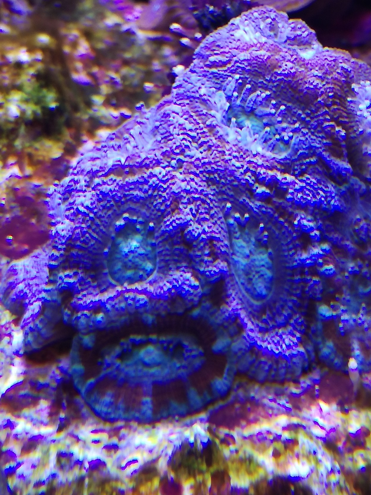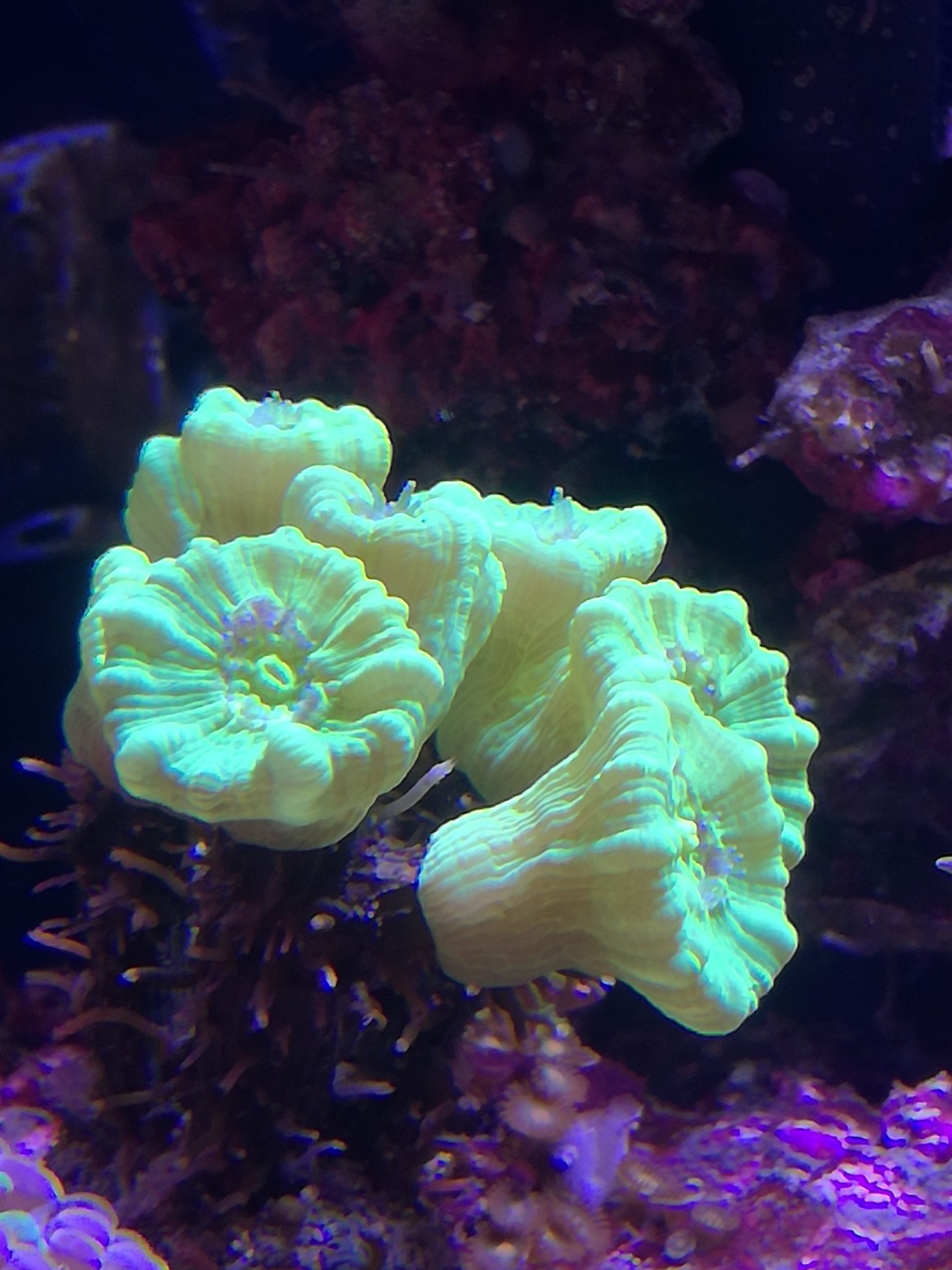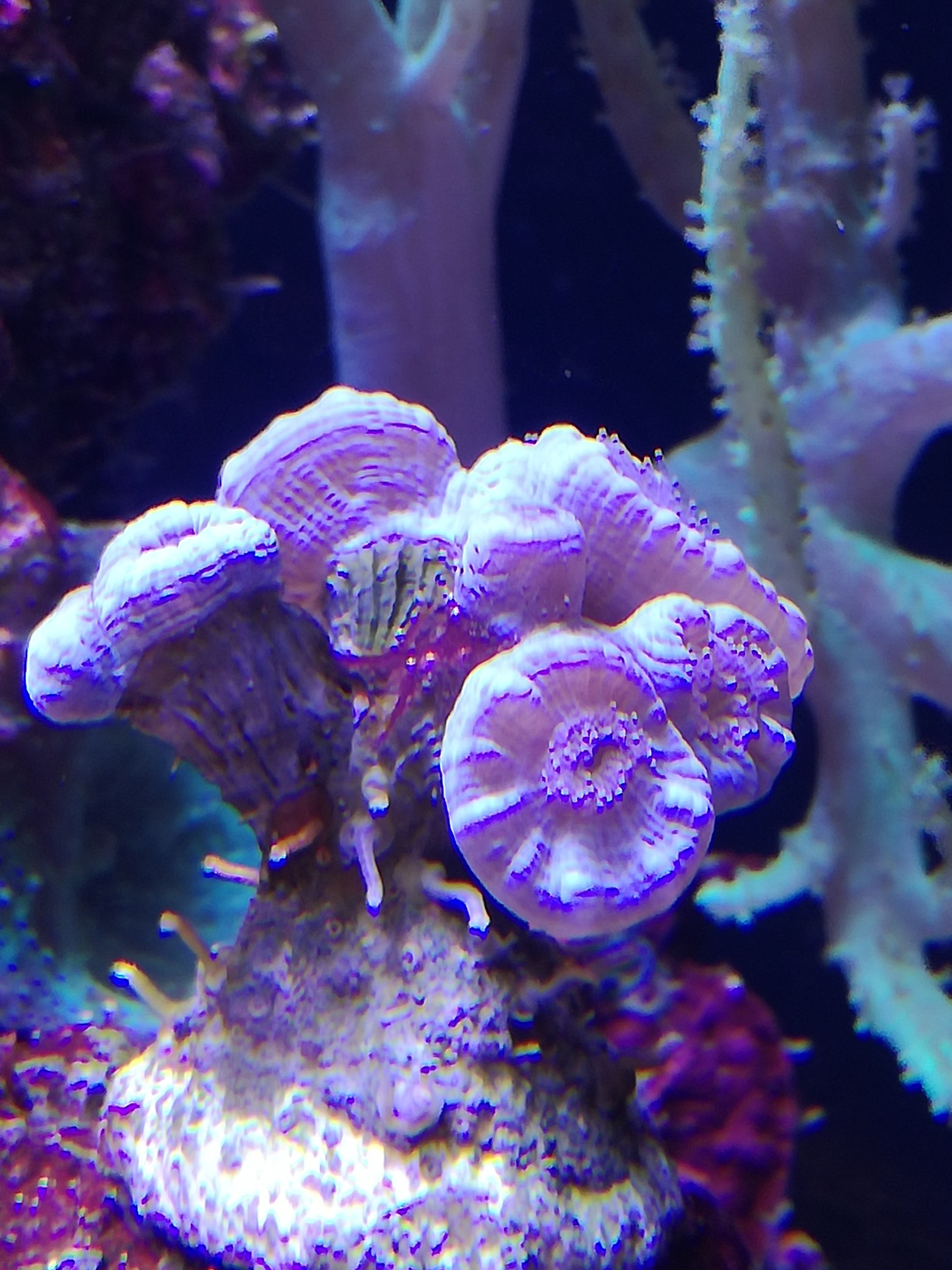 die Hydnophora erholt sich grade vom Strahlungsstress, sie steht aber ziemlich hell, täuscht etwas auf dem Foto.