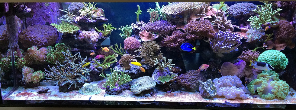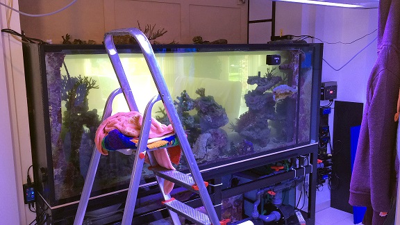 Es ist einiges passiert. Da ich ja leider kein Bonsairiff betreibe, musste ich mal etwas härter durchgreifen. Auf der linken Seite hatte ich bereits im Januar einige große Hystix entfernt, um die Strömung zu verbessern. Nur wurde die Poccilopora auf dem rechten Riffdach sogroß, dass sie bereits zur Oberfläche wuchs und alles darunter abschattet.