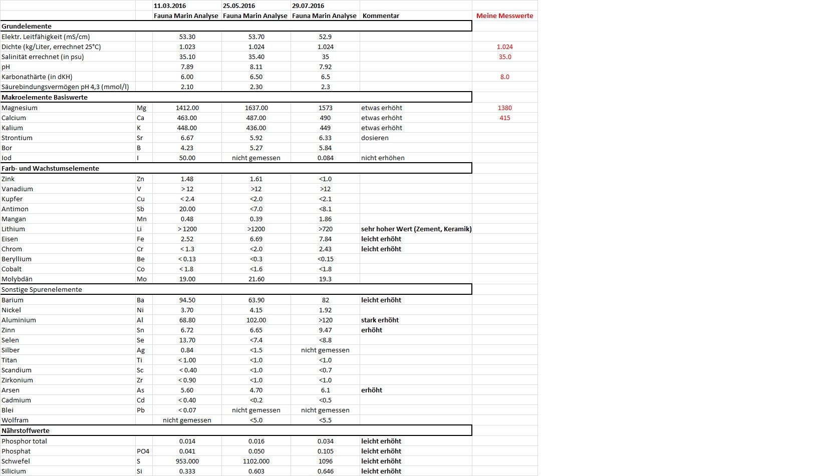 die Werte sehen erstmal soweit ok aus. Lithium und Aluminium sind halt sehr hoch. Die leicht erhöhten Makroelemente, bei denen du mit deinen Tests zuhause niedrigere Werte misst, sind kein Problem. Hast du denn deine Tests zuhause mal mit einer Referenzlösung gecheckt?