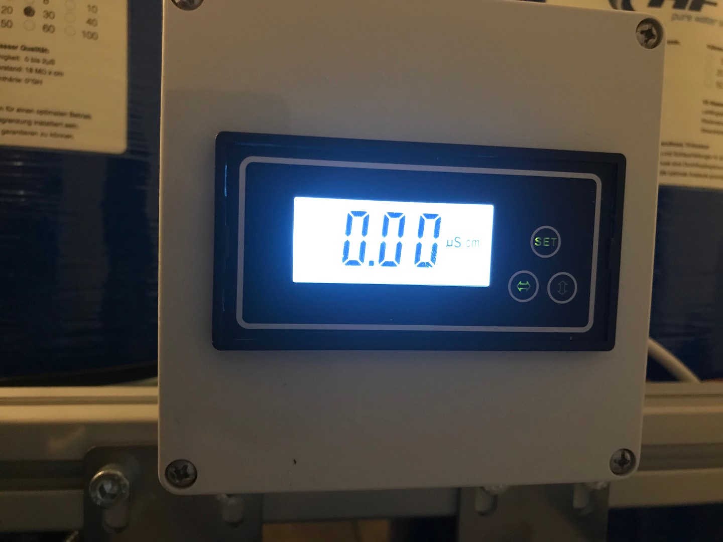 Somit bleibt nur noch eins übrig: Eine Mischbettharz-Anlage. Wir haben uns erkundigt und eine Firma in unserer nähe gefunden die solche Anlagen fertigt und auch die Harze regeneriert. An der Anlage ist ein Leitmessgerät angeschlossen, das einen Alarm gibt wenn der eingestellt Wert erreicht wird. Die Anlage steht im Keller und wir werden noch eine Leitung zum Aquarium installieren, um das Wasser einfach ins Nachfüllbecken zu bringen.