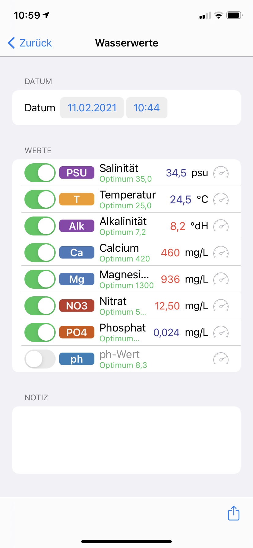 Anbei die neuen Wasserwerte. Magnesium ist zu tief. Ich habe den Salifert Test 4x wiederholt und mit der FM Referenz gegengeprüft. Das versteh ich nicht. Salz ist TM Pro. Sallinität laut Refra. 34,5. Muss ich hier etwas tun? Magnesium wird ja nicht im Sangokai System separat dosiert ?! Ein separates Magensium Präparat habe ich nicht da.