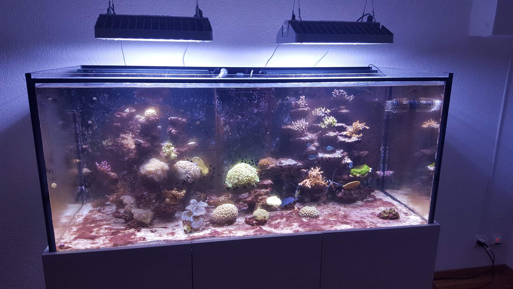 Sehr wahrscheinlich ist der Anstieg der Nährstoffe auf die niedrigere oder andere Beleuchtung zurückzuführen. Bei der ATI hatte ich 580W mit 75% laufen (435W) , die Coralcares laufen ebenfalls mit 75% bei 380W Totalleistung (285W). Die Korallen sehen jedoch super aus und zeigen ein gutes Polypenbild. Wenn der Phosphat weiter steigt werde ich wahrscheinlich die Leistung noch ein wenig erhöhen (80%) und die Kurve ein wenig steiler machen (aktuell mittlere Kurve aus den Sangokai Empfehlungen).