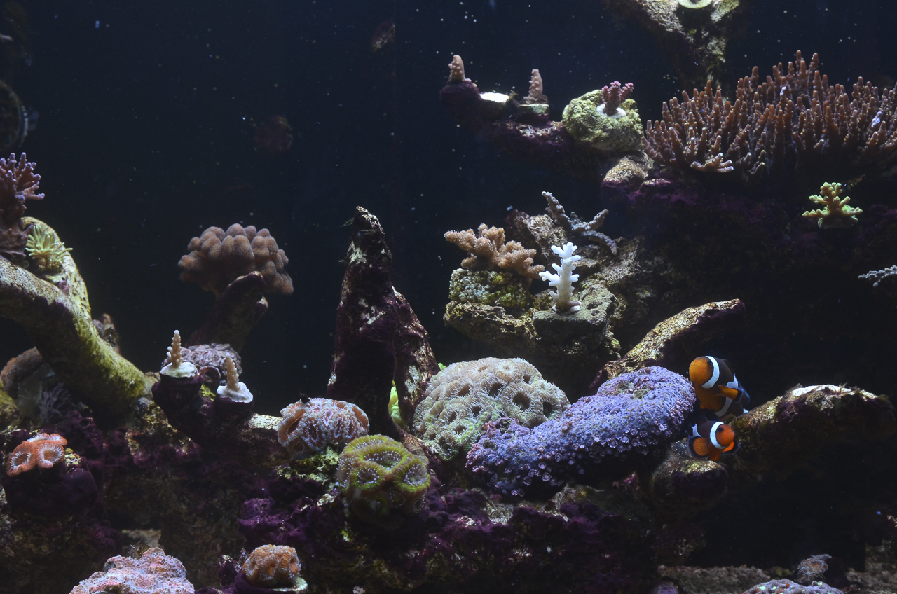 da ich das Gefühl habe, dass die eine Acro, die ein wenig mehr im Schatten steht, seit ein 1-2 Tagen ihrer Polypen mehr ausführt, habe ich das Licht nochmals um 10% reduziert. Vielleicht sind ja die 45% auch noch zu viel.