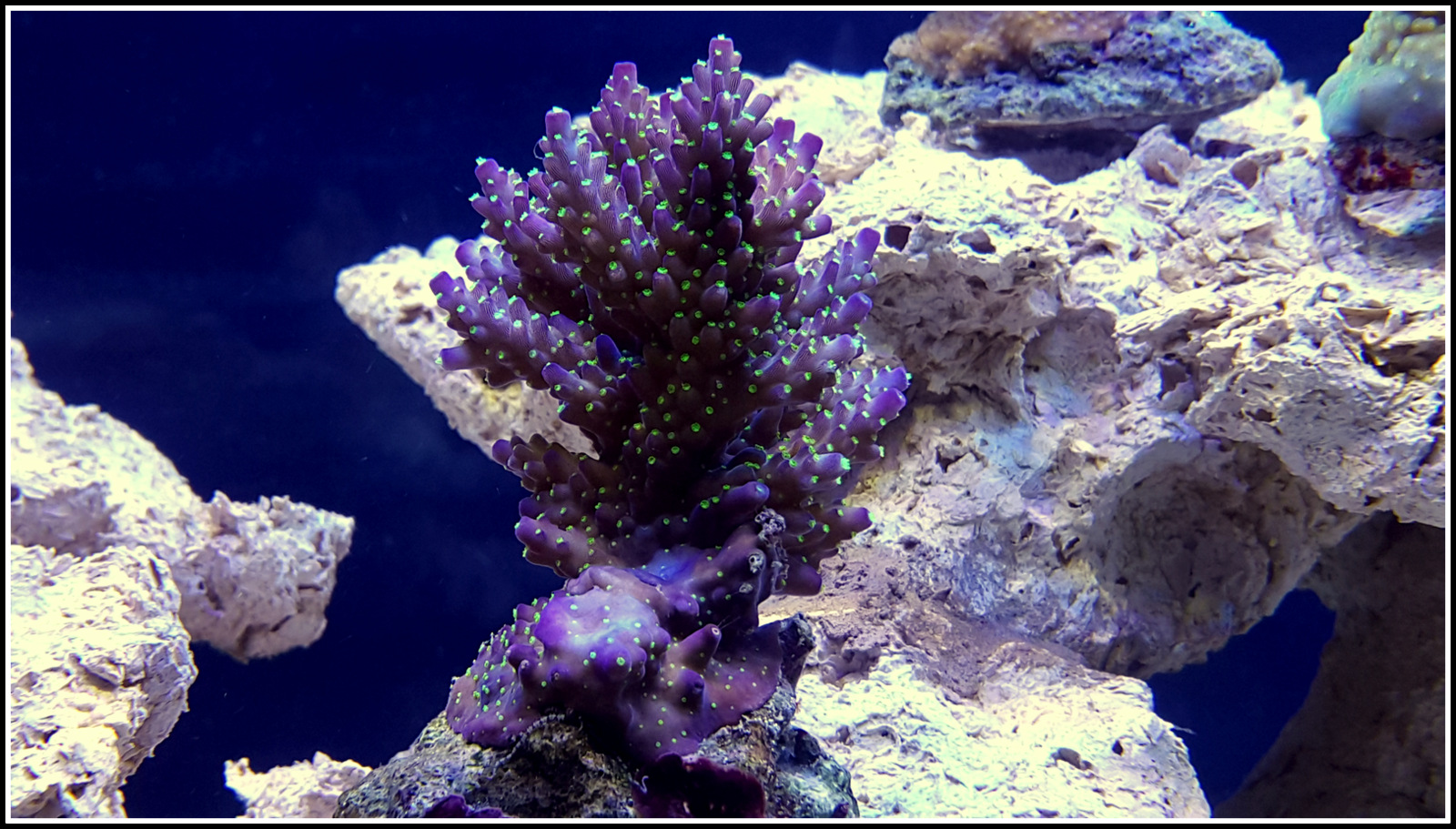Die Korallen kommen langsam ans wachsen. Muss im Moment die KH täglich um 0,2 Grad anheben. Calcium bewegt sich komischerweise aber kein Stück und steht konstant bei 415 mg/l. Die Korallen werden auch heller was mich vermuten lässt das der Po4 Gehalt doch recht niedrig ist, obwohl mir mein Gilbers Test 0,02 mg/l anzeigt. Den Abschaeumer habe ich auf sehr trocken eingestellt.