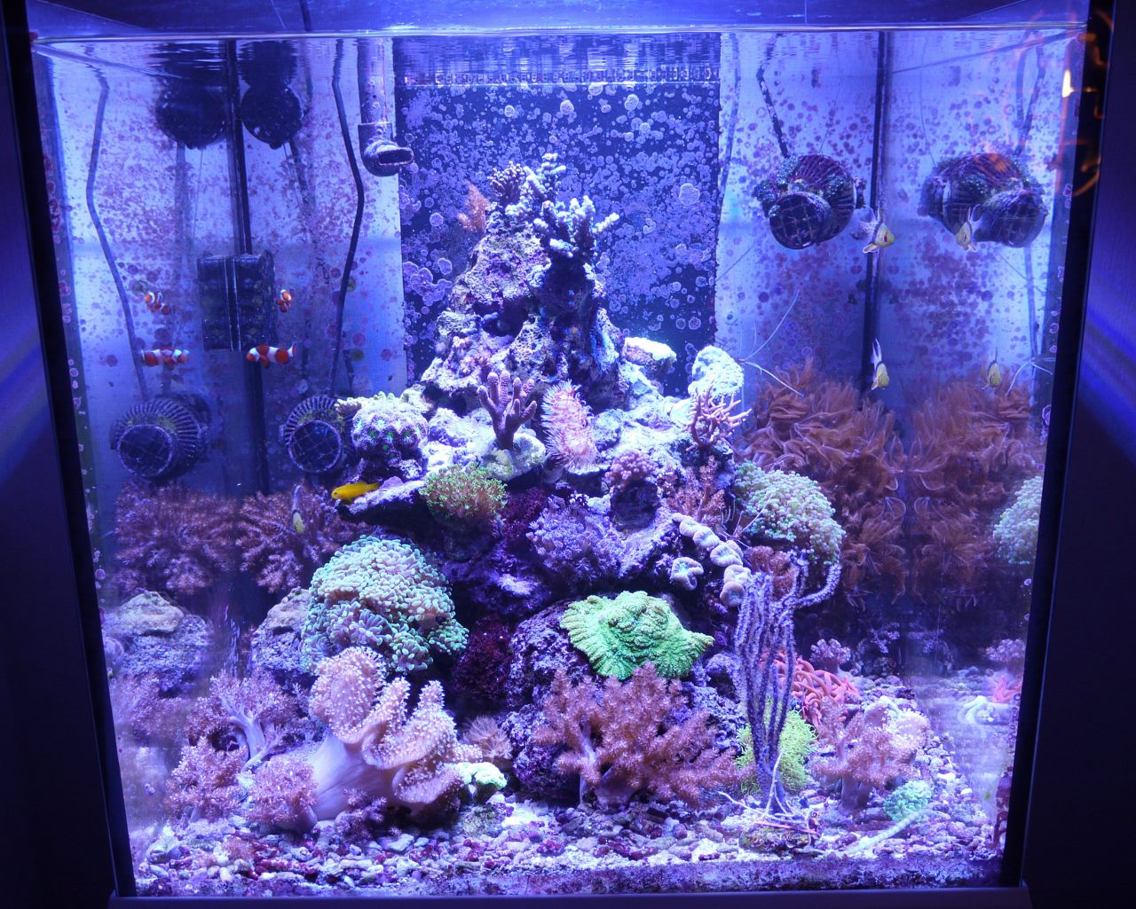 Ich dachte, dass sie Pumpen nicht auf das Riff ausgerichtet sein sollen, sondern eher darüber hinwegstreifen? Ich habe versucht dass die Strömung eine möglichst lange Strecke zurücklegt wovor sie auf die Scheibe prallt. Ich habe beide Pumpen mit 12V laufen und in einer Kombination aus Puls und Intervall, wobei keine der Pumpen komplett aus geht.