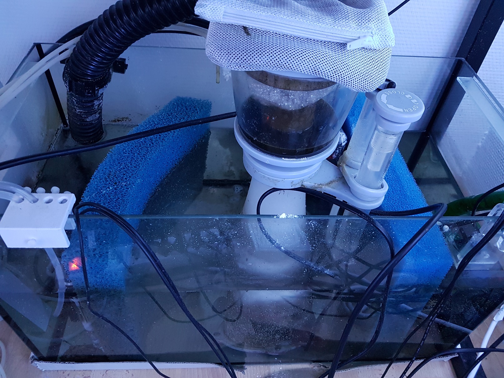 Die Filtermatten kann ich gerne rausnehmen, wenn das eine Besserung bringt. Die waren vor allem da, um die Abschäumer-Blasen im Wasser zurückzuhalten, bevor sie ins Hauptbecken zurückgespühlt werden.