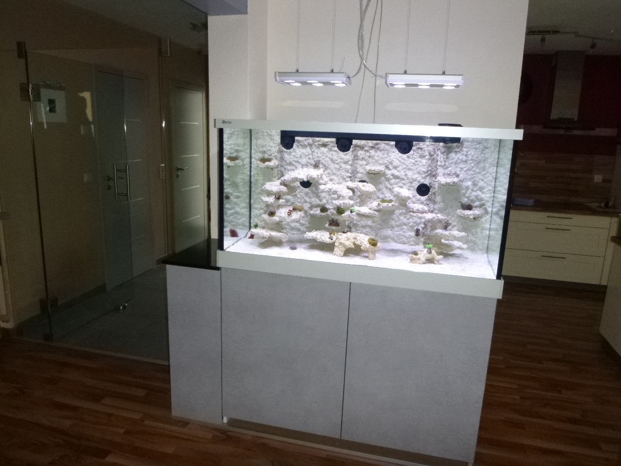 Der Vorbesitzer ersetzte die "Haustechnik" durch Royal Exklusiv Teile. Also Abschäumer und Rückförderpumpe. Aus genannter Hitzeangst ersetzte ich die T5 Beleuchtung durch 2 GHL Mitras 7206. Außerdem baute ich den Unterschrank so um, dass ich linksseitig zusätzlichen Raum habe. Darin sind GHL Profilux 4 und 2 Dosierpumpen und die zugehörigen Behälter. Dosiert werden soll mit denen Sangokai Balance und Basis.