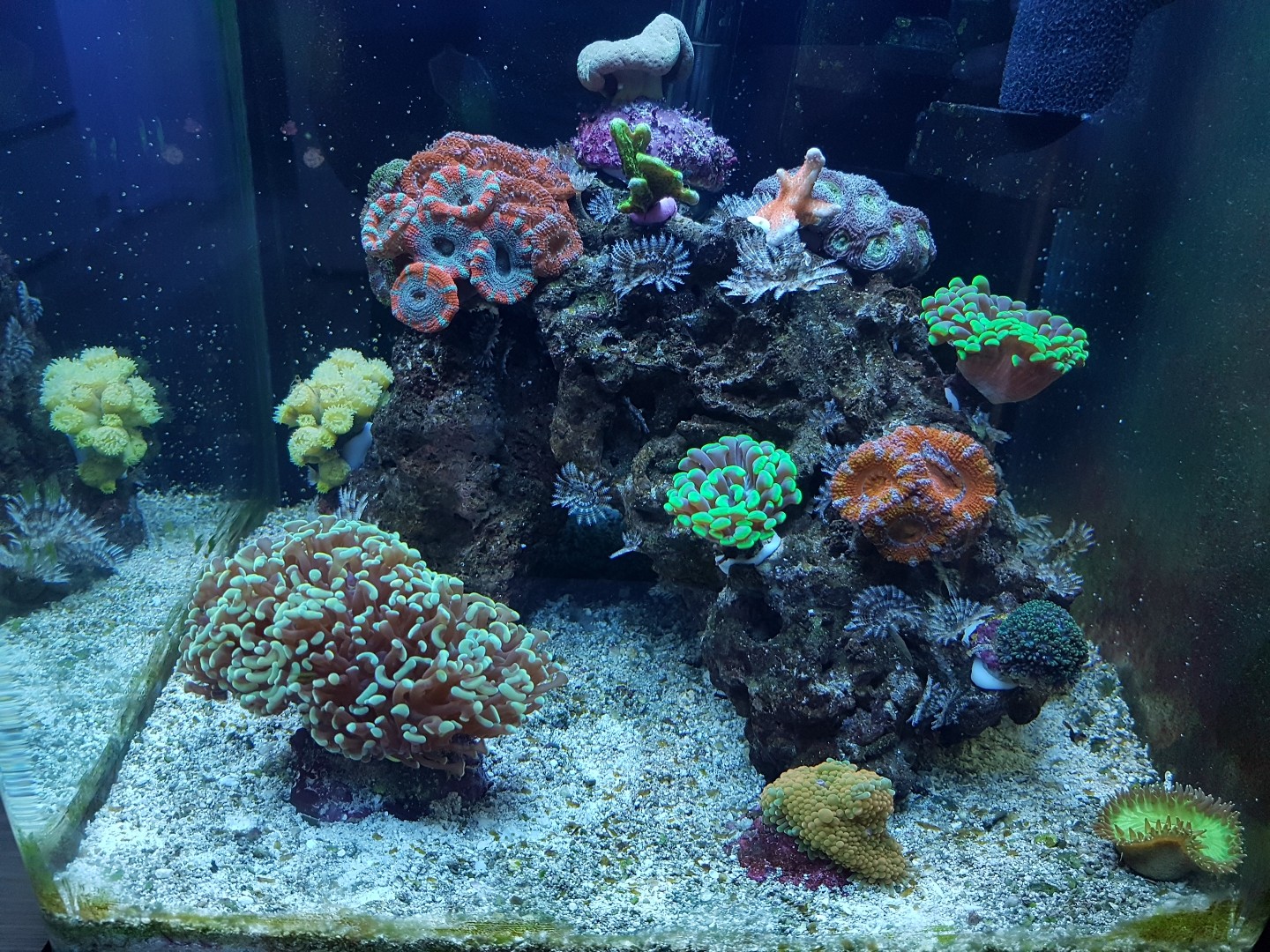 Der Aufbau ist zwar alles andere als gelungen aber meinen Korallen und den röhrenwürmern gefallen die 2 Brocken LS. Und ich hoffe dass die ministückchen SPS, sofern sie erst mal wachsen, ihr übriges tun um den Nano einen ansehnliches Aussehen zu geben.