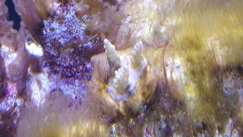 Im Moment habe ich extrem viele Fadenalgen. Dabei habe ich laut meiner Messung NO3/NO2 nicht nachweisbar und PO4 liegt bei etwa 0,01. Die Dosierung des Basis-Systems habe ich bereits halbiert. Einige der Ableger werden auch relativ hell, wie die Acropora auf dem Bild. Andere wiederum haben sich eher brauch verfärbt. Eine Nährstofflimitierung kann ich mir ohnehin nicht vorstellen, da ich ja schon den kompletten Fischbesatz im Aquarium habe und noch kaum Verbaucher.