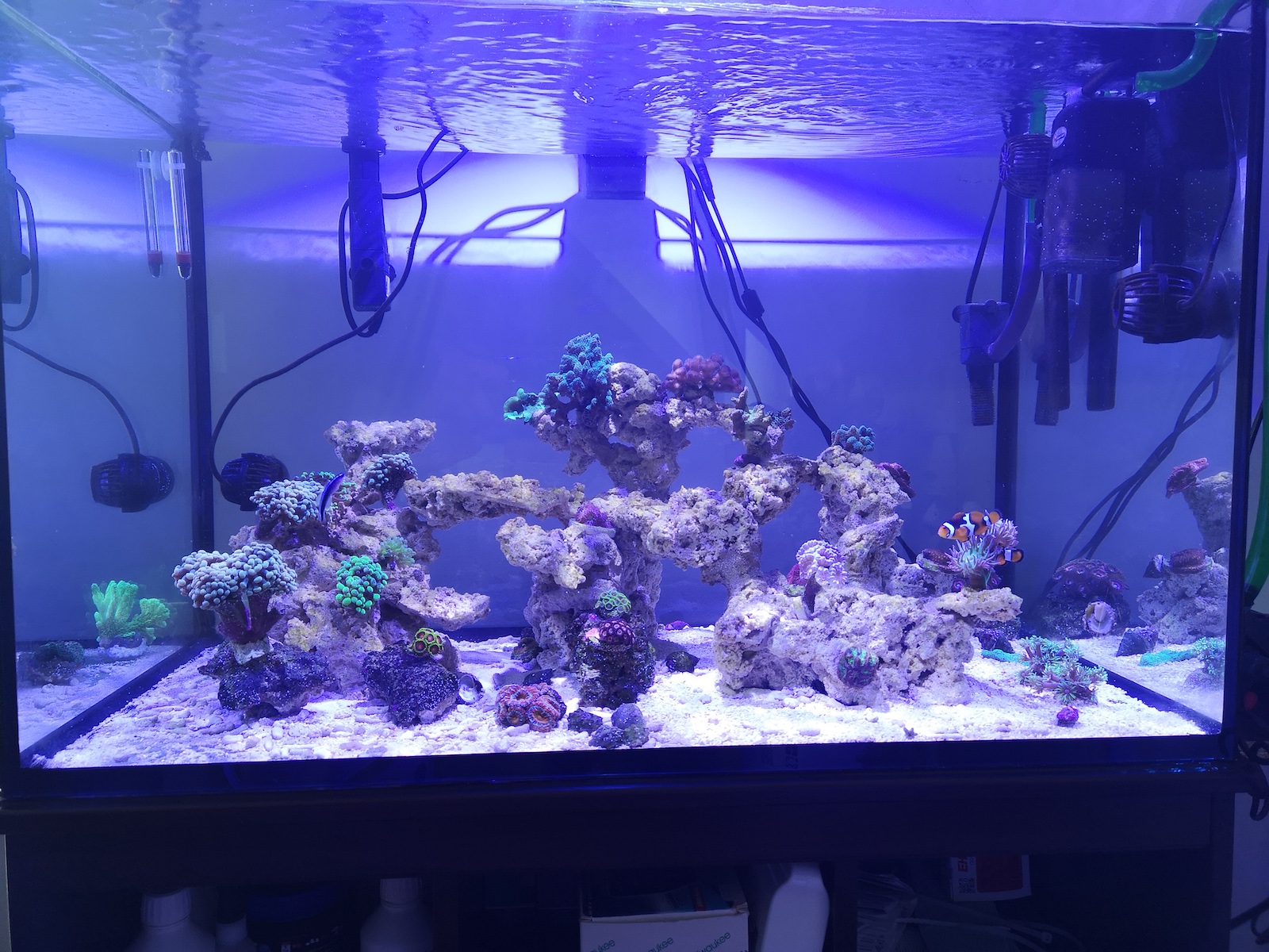 Die Technik für das Becken ist nahezu gleich geblieben. Heute kam noch eine 3. Strömungspumpe dazu um den mittleren Bereich des Beckens besser zu durchströmen. Da war ein toter Bereich um die SPS herum. 0 Polypenbewegung. Gleichzeitig lasse ich dieses Mal von Beginn an eine UVC Anlage laufen, die ich mit einer Förderpumpe betreibe. Daher sieht es etwas wild in der hinteren rechten Ecke aus