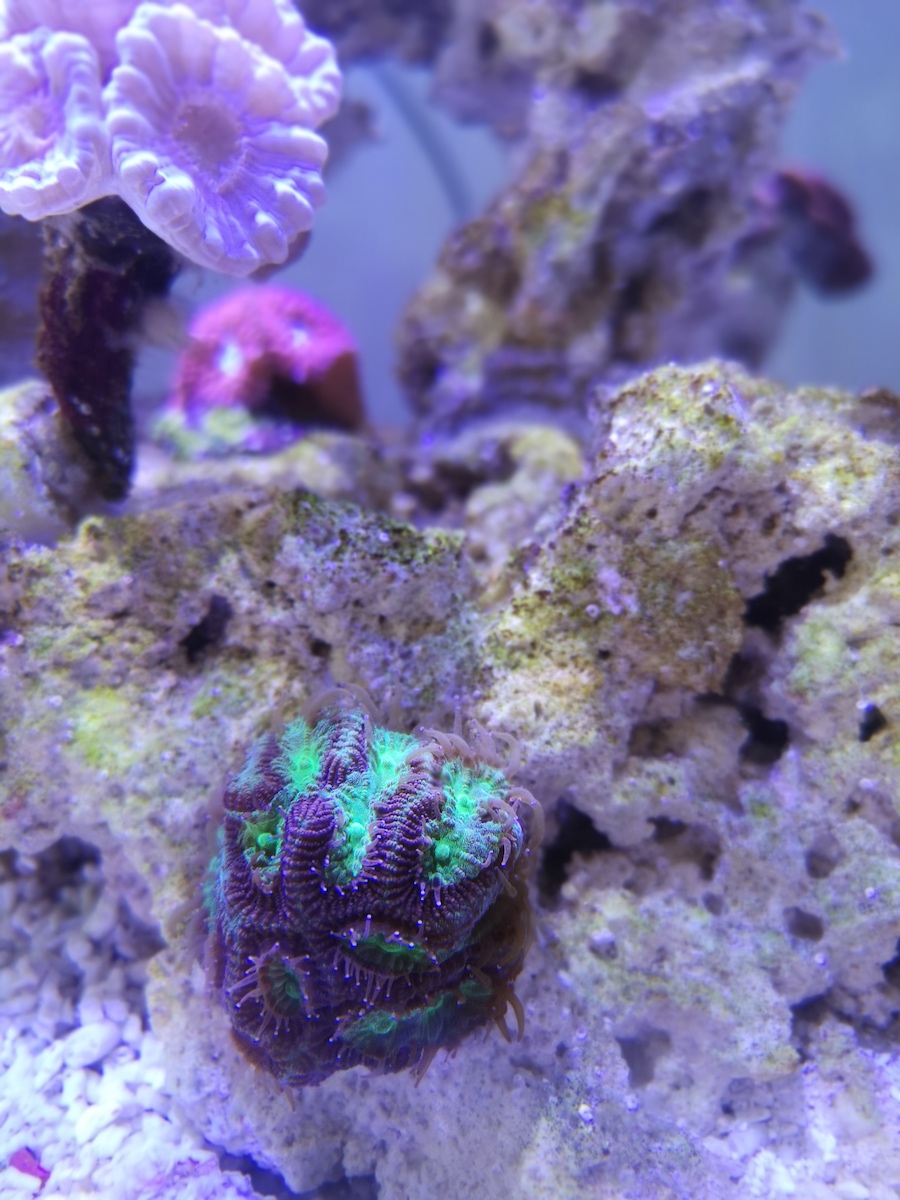 Das neue Becken soll überwiegend ein LPS Becken werden, da ich in den letzten Wochen gemerkt habe, dass ich persönlich als Anfänger mit einem SPS lastigem Becken nicht klar komme. Da fehlt mir einfach die Erfahrung um rechtzeitig Veränderungen zu bemerken und vor allem korrekt gegenzusteuern. Die bisherigen SPS habe ich ins neue Becken übernommen und schaue, wie sie sich entwickeln. Lediglich die Montipora Platte wächst wie verrückt von alleine, was die SPS angeht.