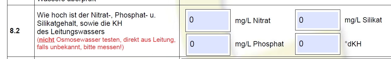 Als Anmerkung steht im Bogen "nicht Osmosewasser testen, direkt aus Leitung, falls unbekannt, bitte messen!"