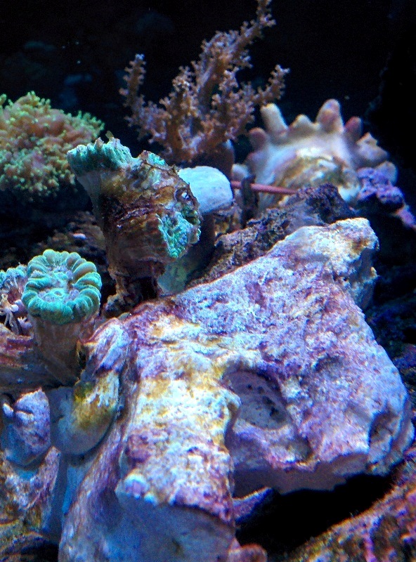 Der Start des Beckens erfolgte am 06.12.2014. Die klassische Einlaufphase verlief wie im Bilderbuch: Wasser angesetzt - Riffsäule aus Lebendgestein gebastelt - nach 3-4 Wochen wurde es etwas Kieselalgig - weitere 2-3 Wochen kamen die grünen Fandenalgen - Einzug von Einsiedlern, Turboschnecken und die ersten Weichkorallen - Alles super! Allerdings blieben hier schon die oft beschriebenen Ammonium, Nitrit und Nitrat-Peaks völlig aus! Naja, nix bei gedacht, denn die Paar Korallen sahen ja zufrieden aus.