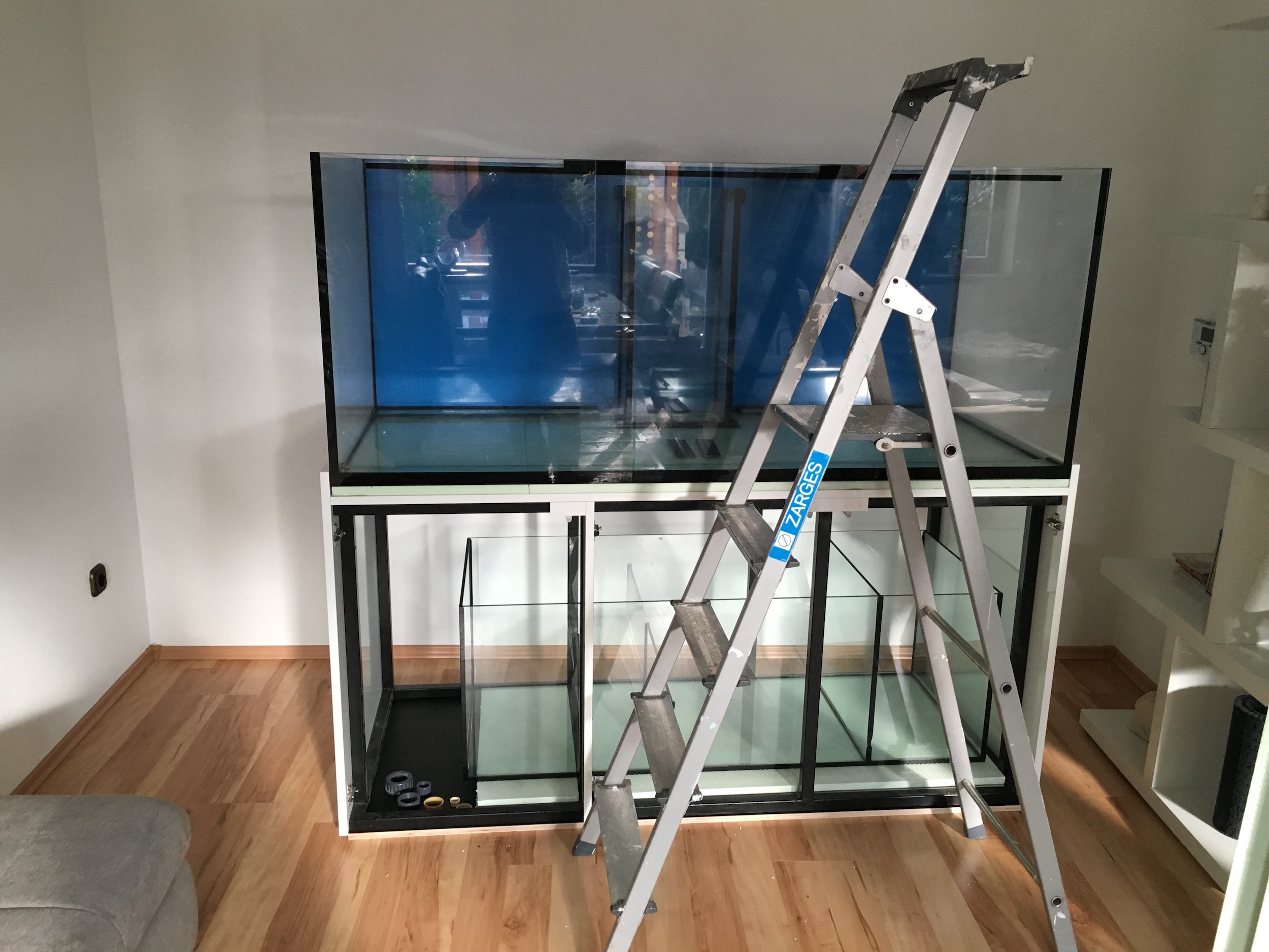 Das Becken hat die Maße: 160x70x66cm LxTxH und wurde inkl. Stahlgestell und Hochglanzverkleidung von Jeko-Aquaristik gebaut und geliefert.