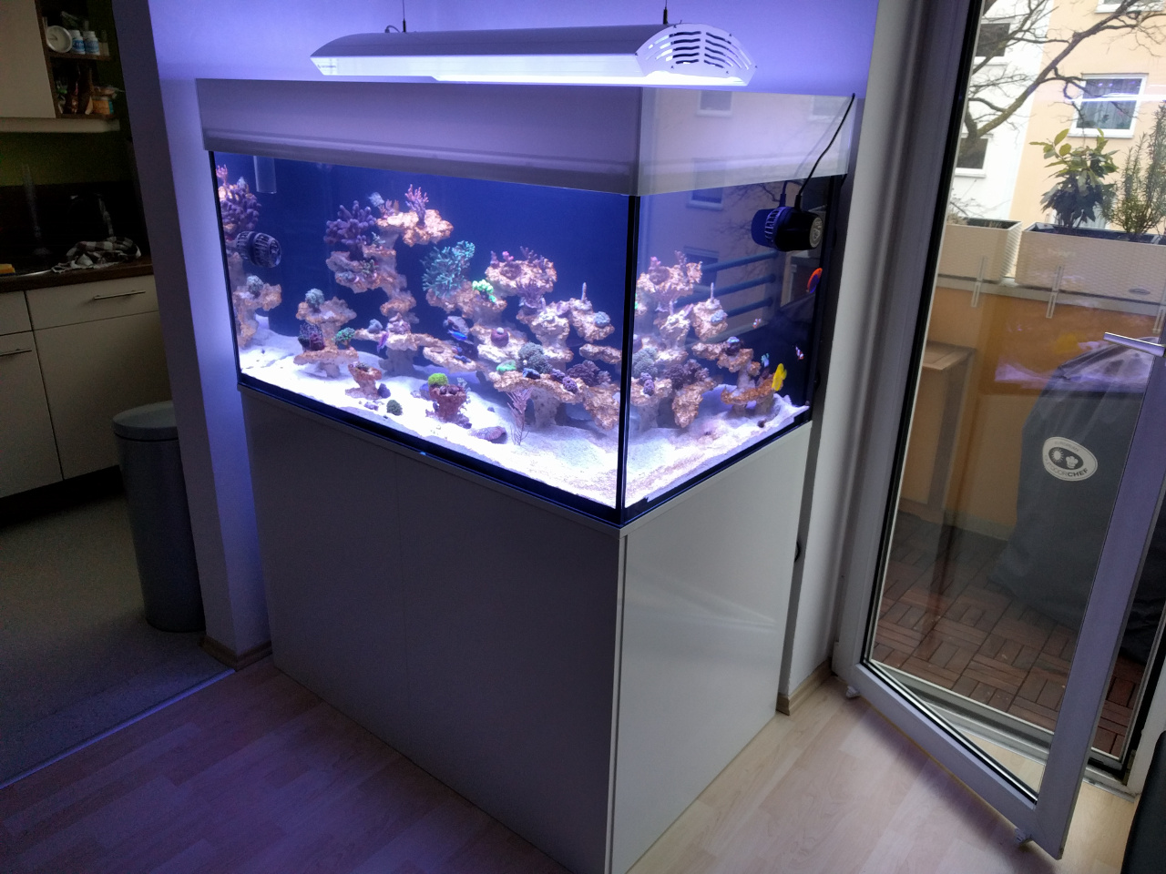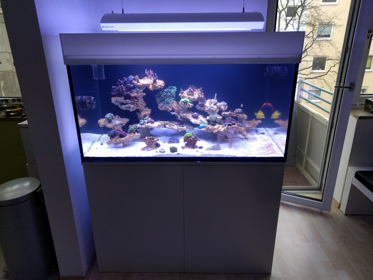 ich hatte bis vor kurzem noch ein EHEIM incpiria marine 300 welches ich hier damals vorgestellt hatte. Vor 2 Wochen wurde dieses mit einem, maßangefertigten, 500 Liter Becken ausgetauscht. Da das neue Becken an der gleichen Stelle wie das Alte stehen sollte, wurde alles an einem Tag umgezogen. Sprich Tiere usw. aus dem alten Becken raus in Eimern, Wasser abpumpen, leeres Becken in anderen Raum verfrachten, neues Becken aufbauen, komplett neue Riffkeramik von RiffSystem rein stellen (ich habe keine Steine vom alten Becken mit genommen), neuen Sand rein (auch hier ist nichts vom alten Becken mit genommen worden), frisch angesetztes Wasser + ein paar Liter vom alten Wasser rein, Technik anwerfen und den Besatz sofort wieder zurück führen. Am Abend um 21 Uhr war ich dann endlich im großen und ganzen fertig. Wie streßig und anstrengend das ist brauch ich glaube ich keinem zu erzählen :roll: Zum Glück hat bis heute alles überlebt!