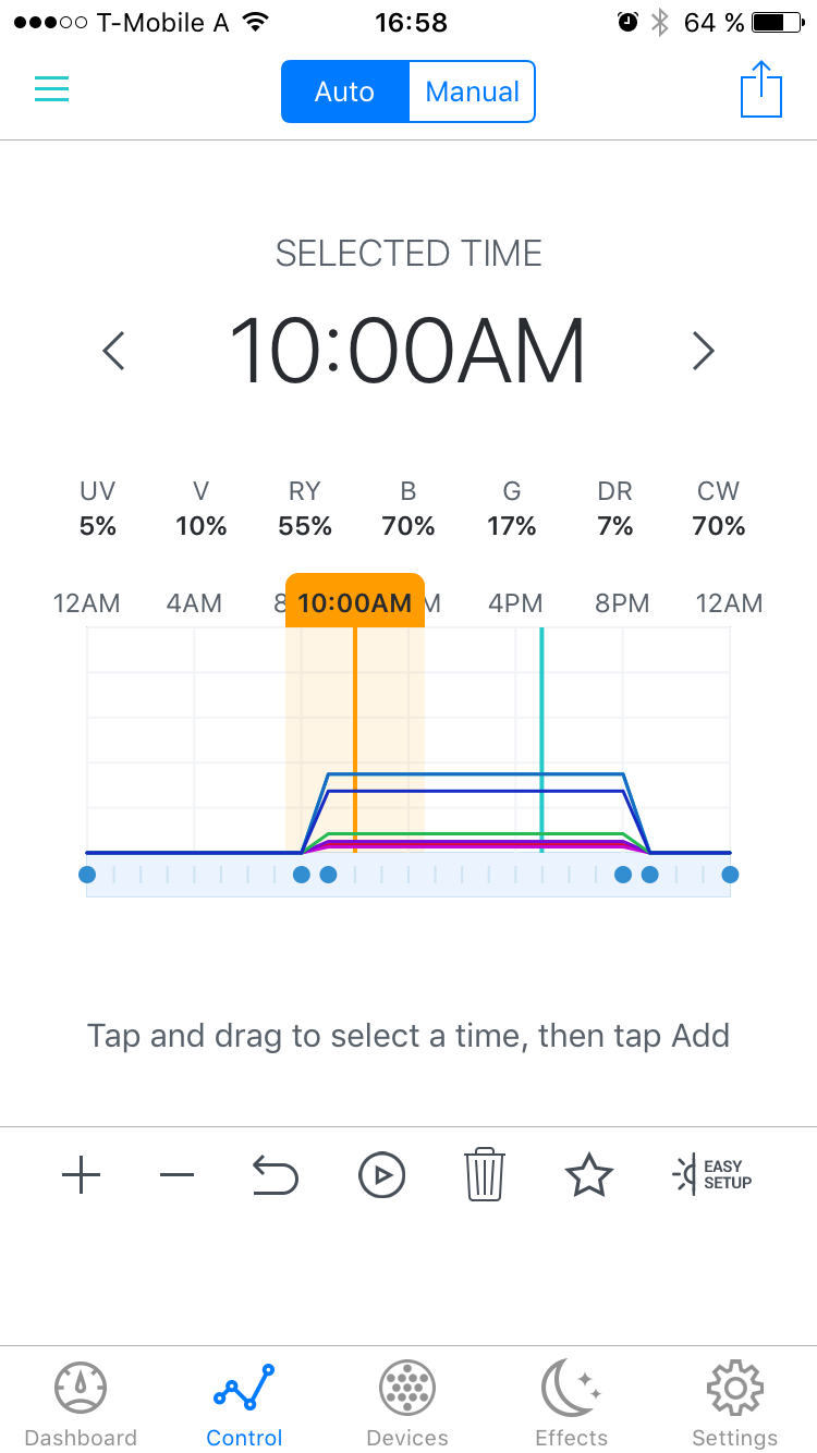 Das Becken sollte möglichst gleichmäßig beleuchtet werden. Bei deinem Profil hast Du nach ein paar Stunden weniger Leistung, dann geht sie wieder nach oben, zieht also bis am Abend wieder an und dann wieder runter. Das ist so kein natürlicher Verlauf.