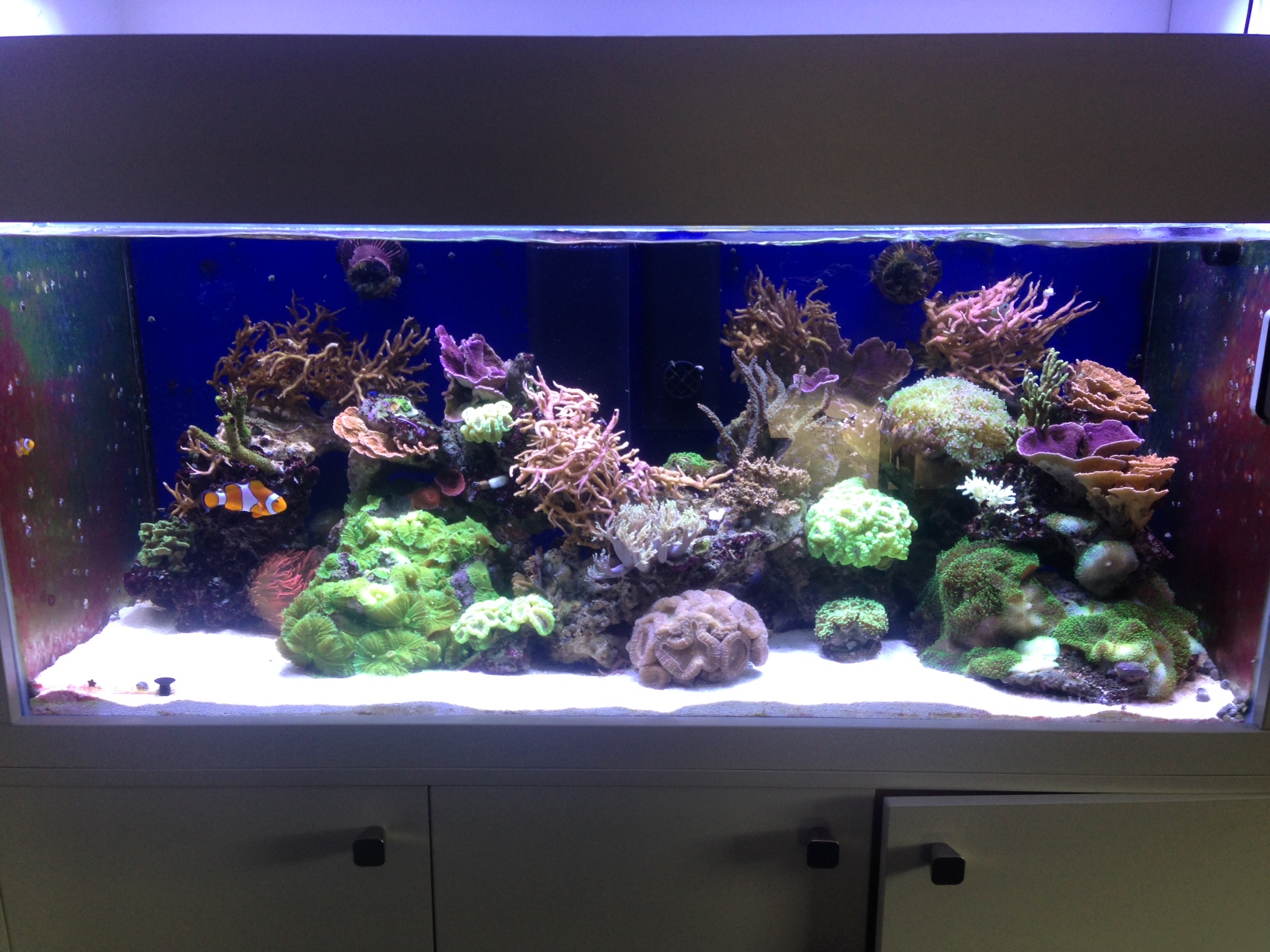 Die Fische sind erst vor einer Woche eingezogen, direkt vorher (ca. 1 Monat) habe ich das Riff komplett umgebaut, und die Hälfte des Sands getauscht. Da hatte ich kurz sogar 0,1 mg Phosphat, was sich aber mittels Absorber auf 0,05 gesenkt habe. Vor dem Umbau immer gerade nachweisbar.