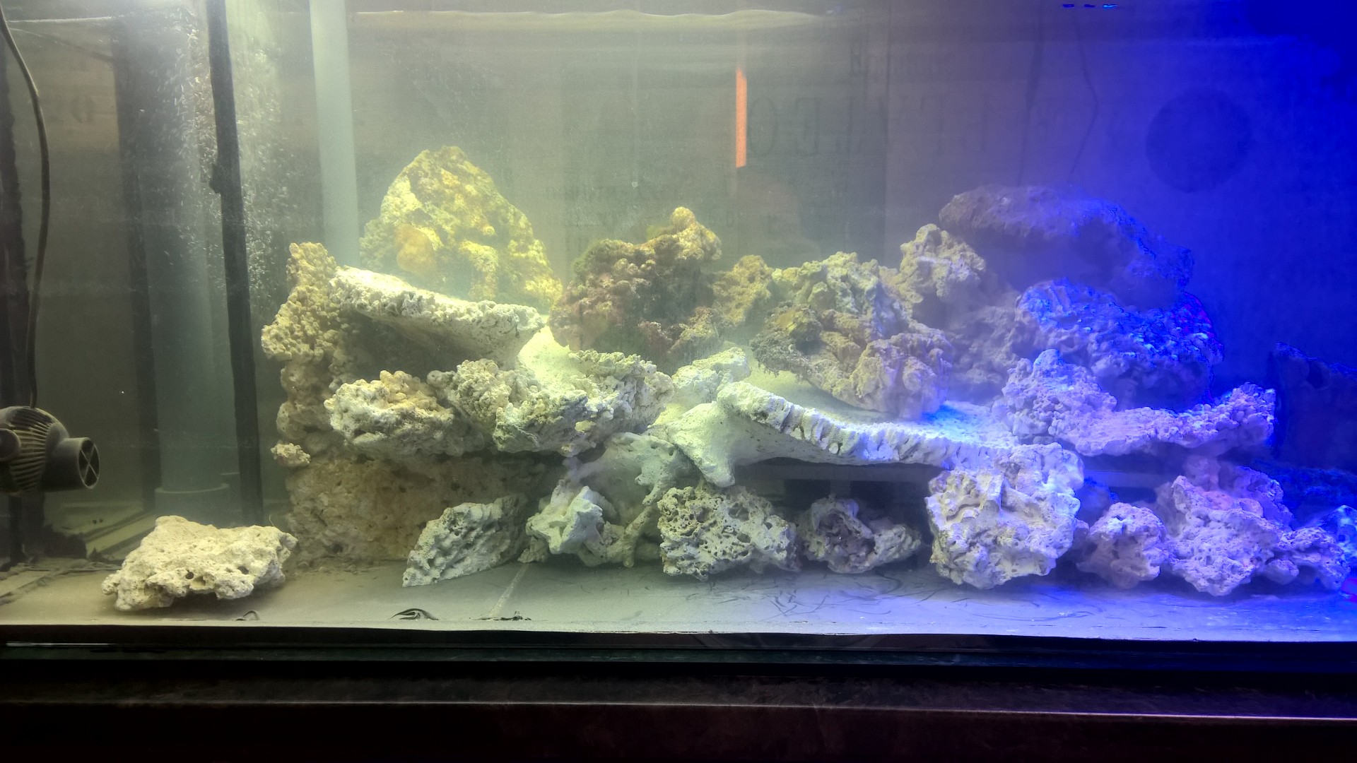 Bei mir liegt nahezu das Ganze Riff auf ein Plato welches von der Rückförderpumpe unterströmt wird. Hat aber nichts mit dem Bodengrund zu tun denn der wird ja da einfach schlicht und einfach weg gelassen. Ich habe nur an der Frontseite etwas Sand eingebracht der Rest wird Unterströmt.