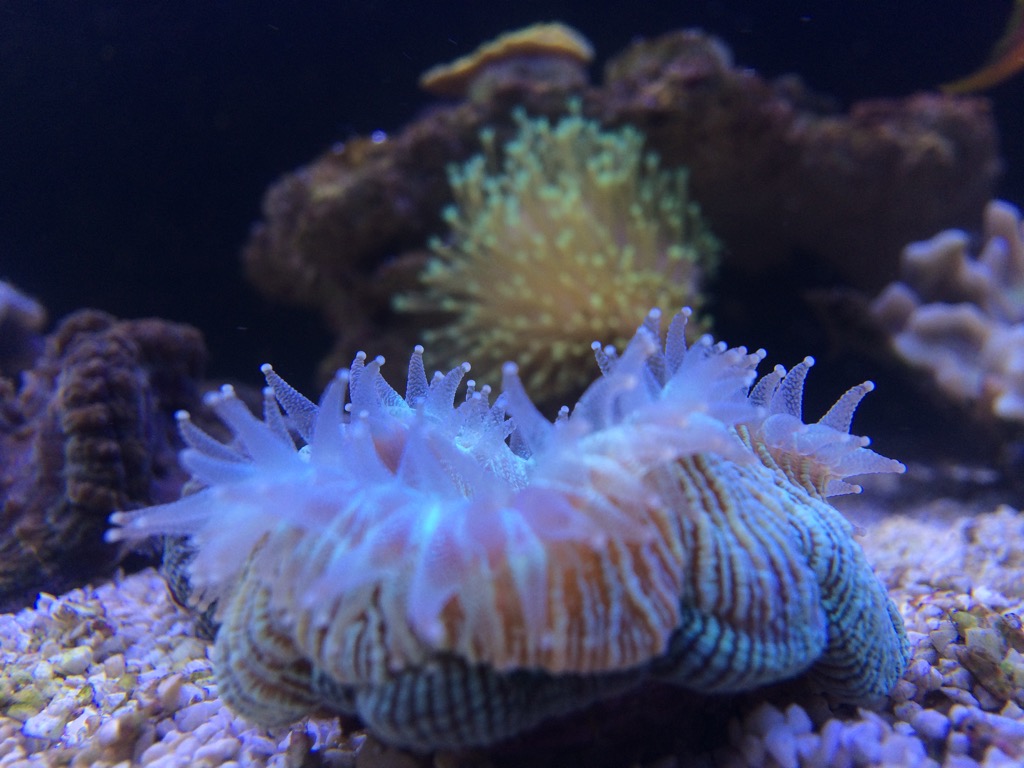 Die Cyanos gehen weiterhin laaangsam zurück, durch die Dosierung des Phosphats bekomme ich leichte Algenbeläge auf dem Bodengrund, aber alles noch im Rahmen. Die Korallen öffnen immer besser und es gab keinen weiteren Ausfall. Am Sonntag war ich erstmals bei einem Meerwasseraquarianer in meiner Nähe und habe mir ein paar schöne Tiere mitgenommen. Allen geht es gut.