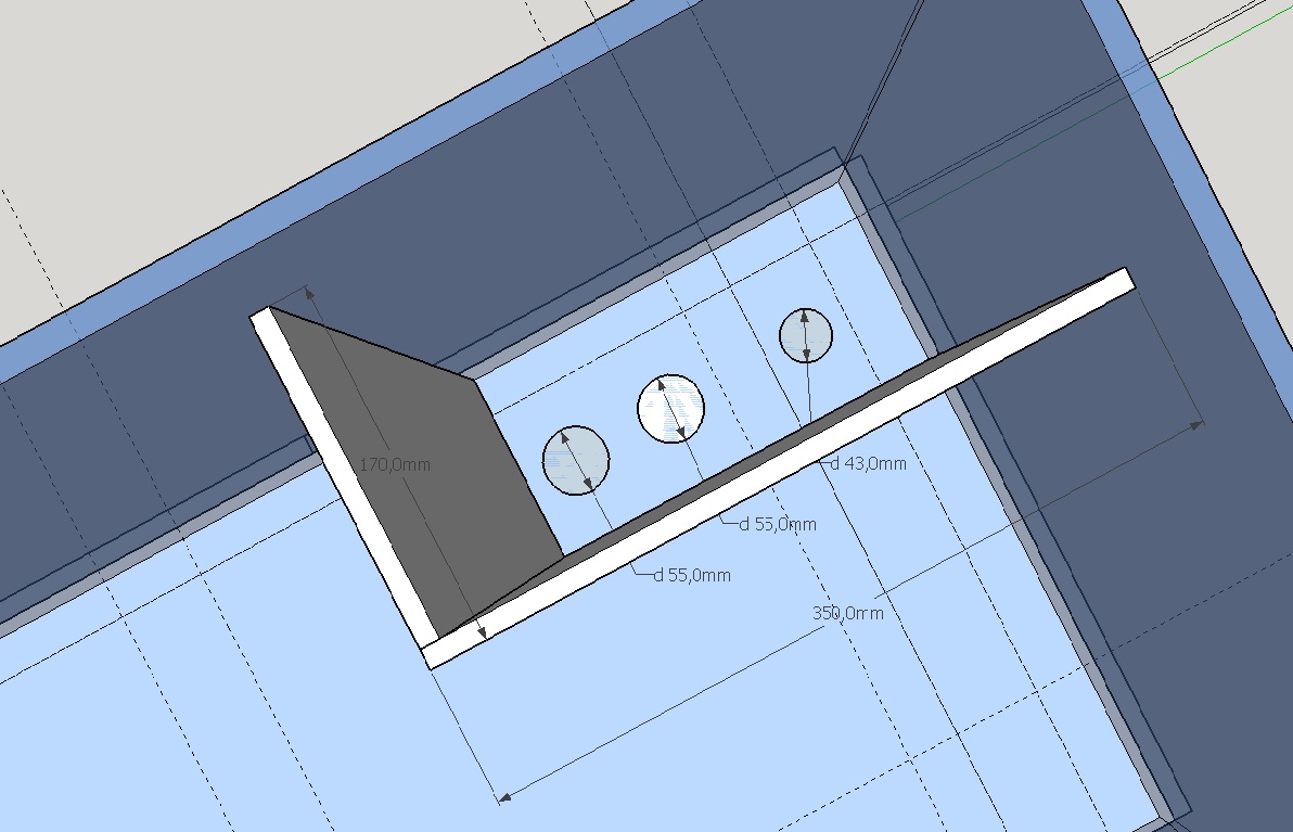 Die Linien auf der Skizze stellen die Balken da, die sich im Unterschrank unter der Platte zwischen Aquarium und Schrank befinden. Bin daher mit der Plazierung des Schachtes und der Bohrungen etwas eingeschränkt.
