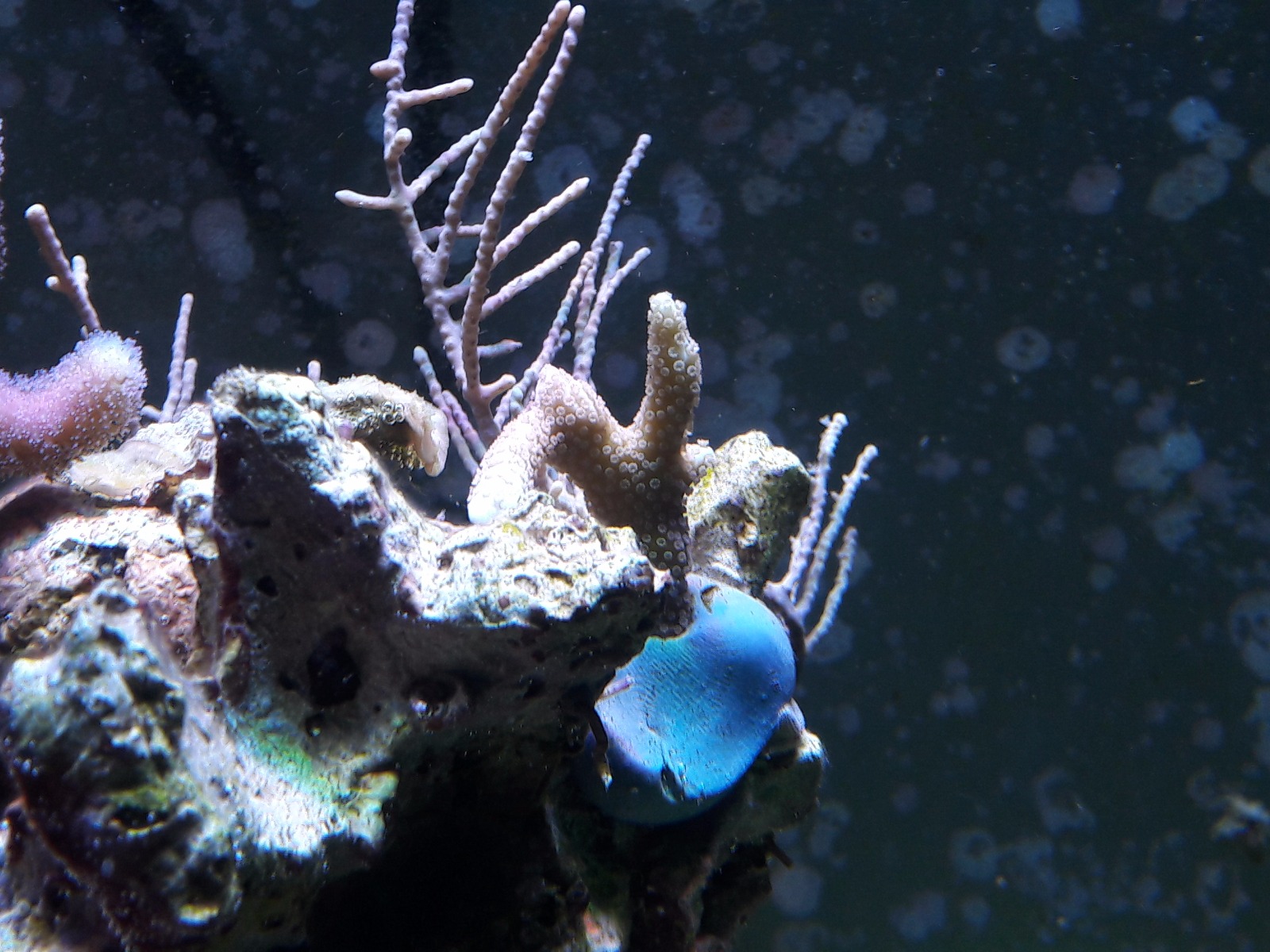 Beim Becken handelt es sich um ein 200L Becken. Die einzigen Tiere sind zwei Kaudernis, zwei Blaustreifen Seenadeln, Einsiedler, Garnelen, ein Globulus Seeigel und Schnecken. Dazu kommt ein Mischbesatz an Weichkorallen, SPS, LPS und höhere Algen. Alle Korallen zeigen ein schlechtes Farbbild (bleich). Die SPS zeigen noch ein schönes Polypenbild aber bei den LPS wurden die Polypen deutlich kleiner. Zoanthus wachsen nicht mehr und auch die Discosoma sind stark geschrumpft.