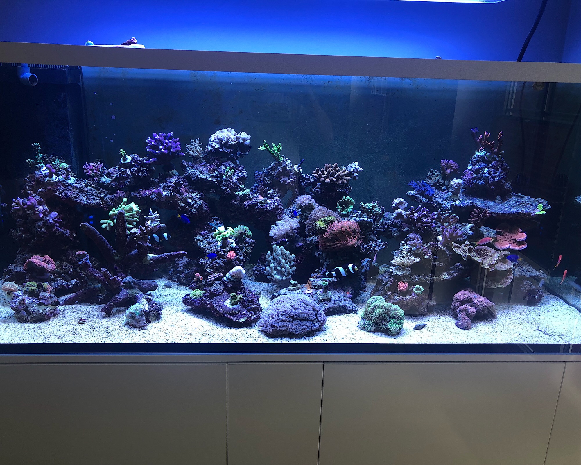 Vielleicht kann mir weiterhelfen, ich habe eine mögen von dieses weißen, denke es ist kalkartig, Punkten. Hat angefangen im Ablauf Schacht, wird aber immer mehr, auch im Riff und TB. Ich hoffe man erkennt es auf dem Foto.
